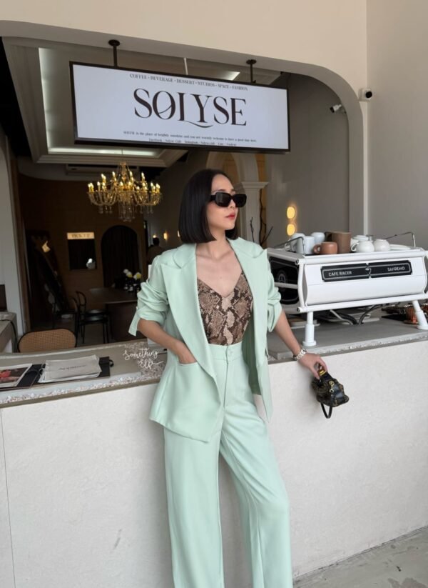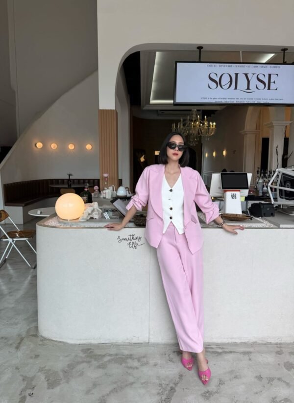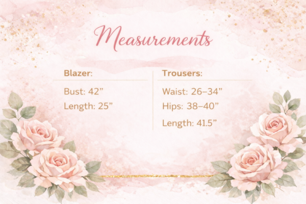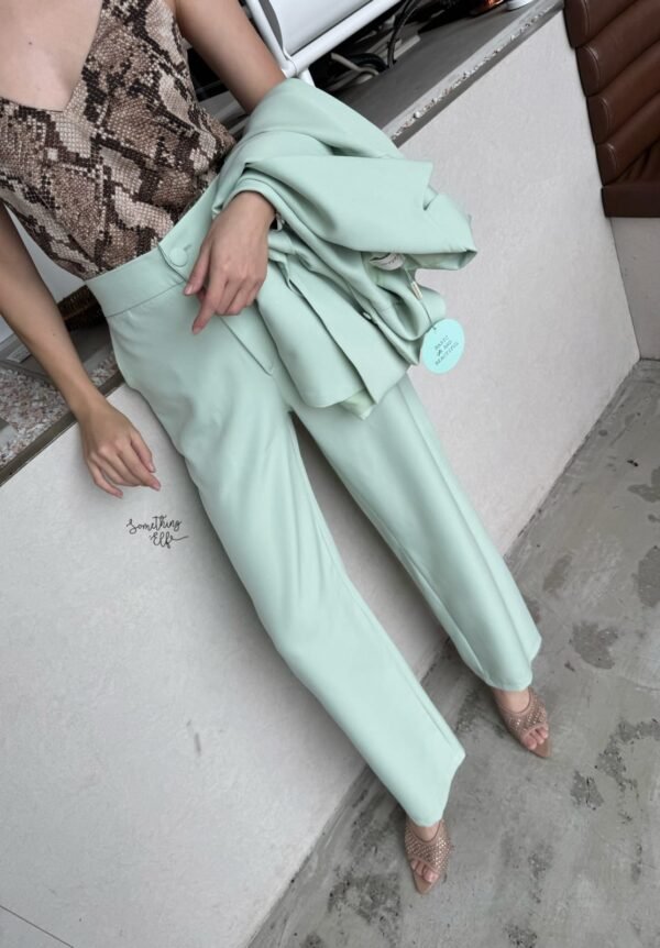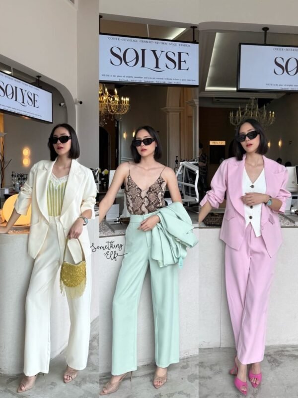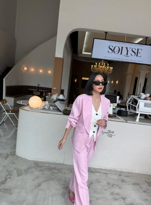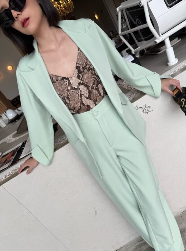 A stylish 2-piece set featuring a blazer with a wide lapel, fastened with a single fabric-covered button. It features two slanted slit pockets and chic folded-cuff sleeves. The set comes complete with matching trousers featuring a front button closure and a smocked elastic waistband at the back. Crafted from high-quality, fine-textured fabric in beautiful pastel tones—perfect for formal events or as bridesmaid attire!