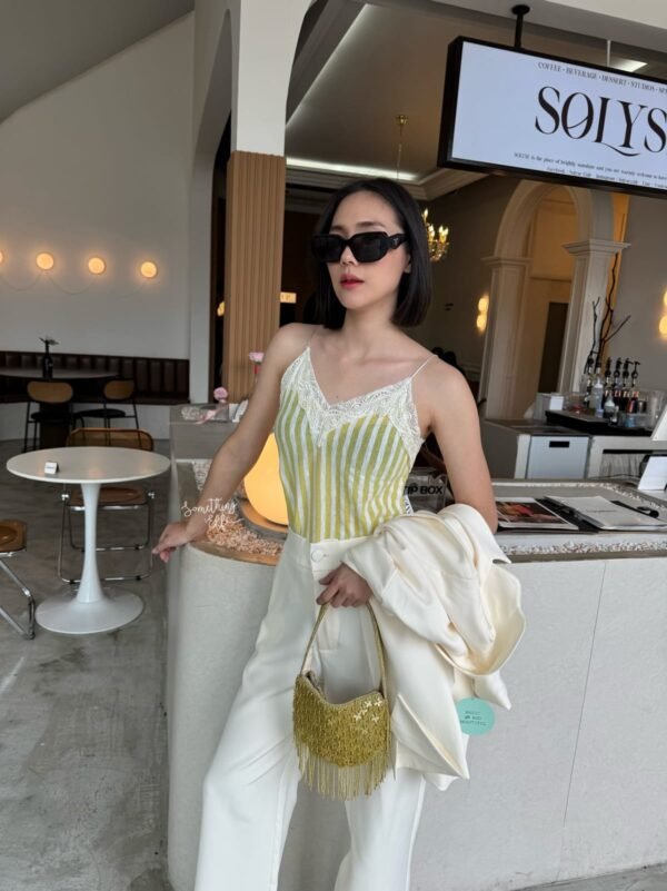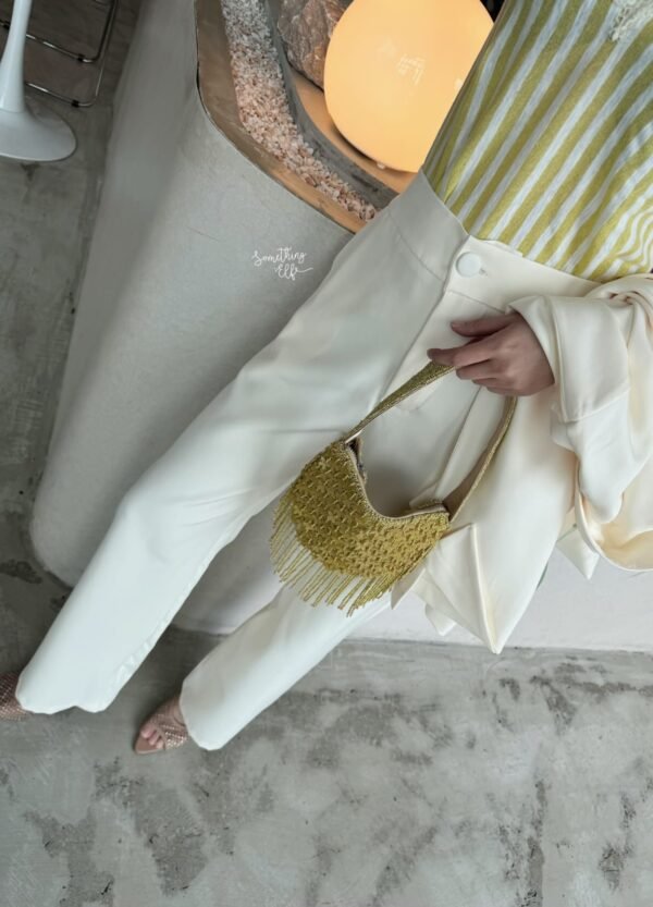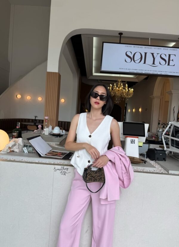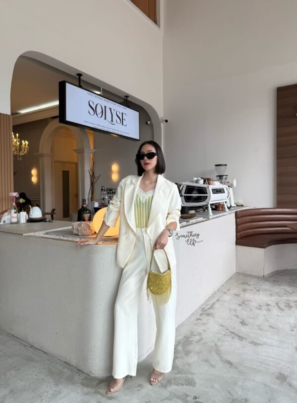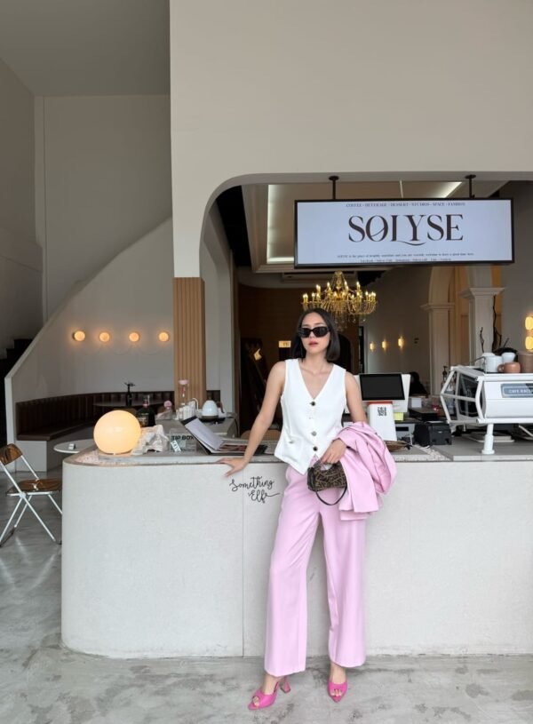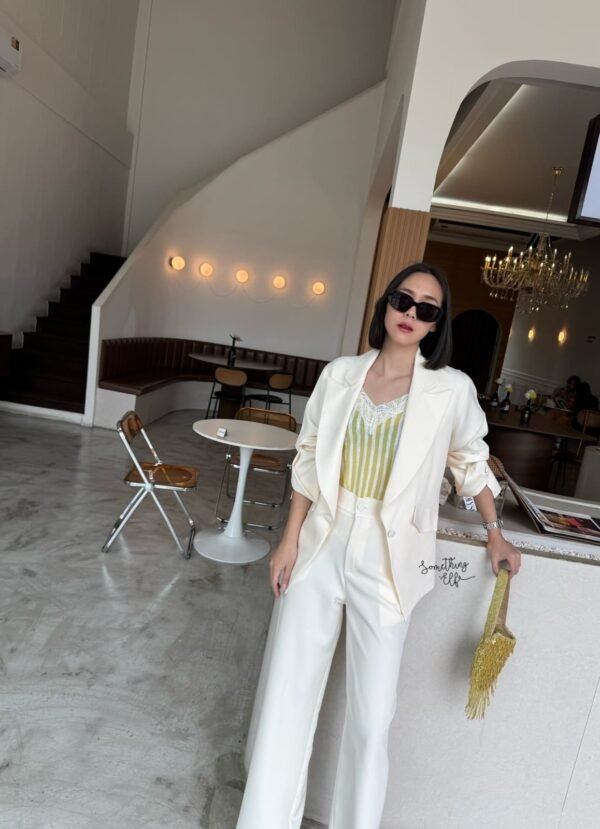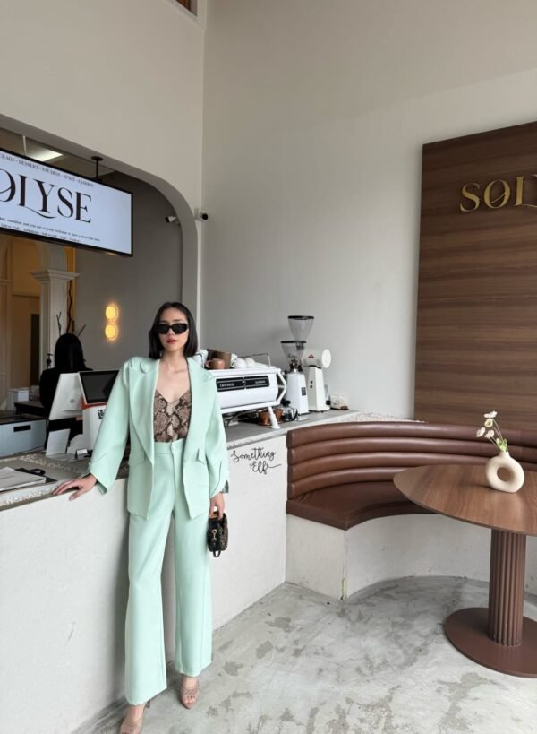 A stylish 2-piece set featuring a blazer with a wide lapel, fastened with a single fabric-covered button. It features two slanted slit pockets and chic folded-cuff sleeves. The set comes complete with matching trousers featuring a front button closure and a smocked elastic waistband at the back. Crafted from high-quality, fine-textured fabric in beautiful pastel tones—perfect for formal events or as bridesmaid attire!