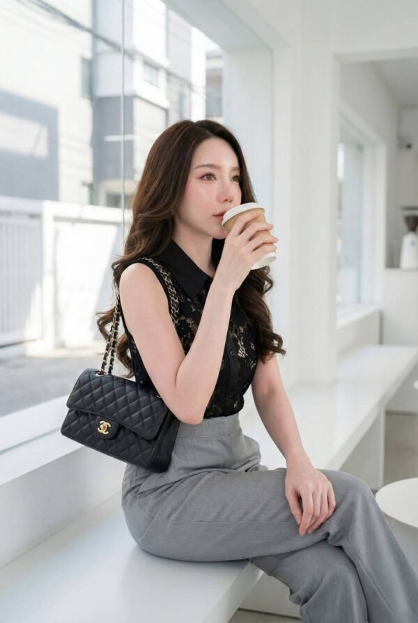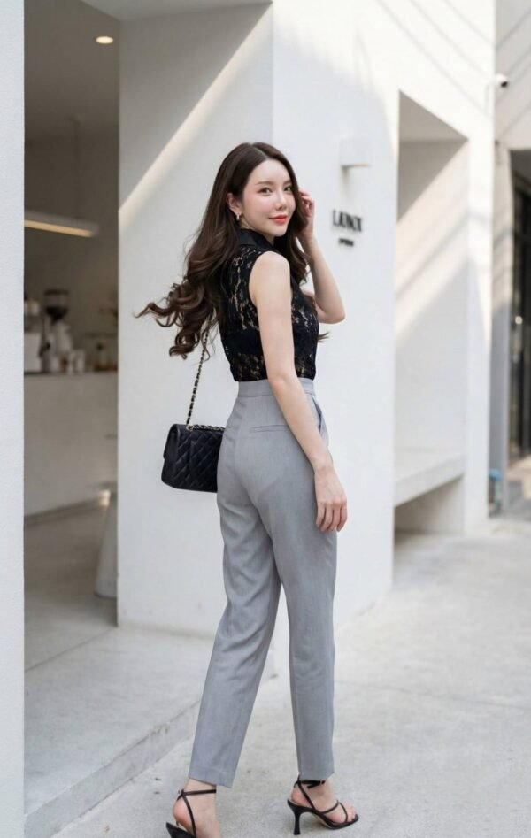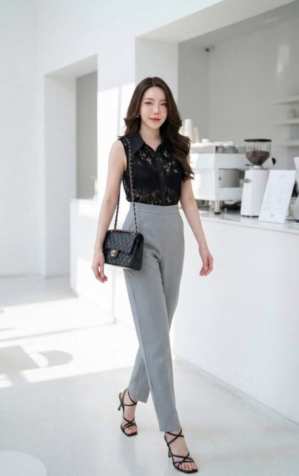 Lace Top & Gray Straight Pants. This set includes a black sleeveless lace top with contrasting plain fabric details on the collar and placket, and gray straight-leg pants with side pockets. Made from high-quality fabric, the pants are lined. This outfit is perfect for many occasions, giving a sophisticated and elegant look. A must-have in your wardrobe!