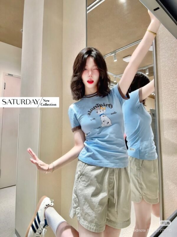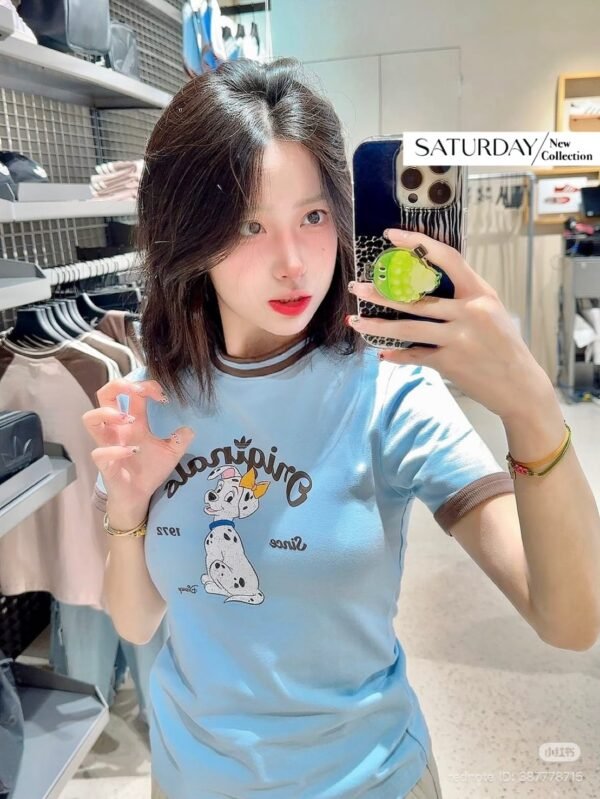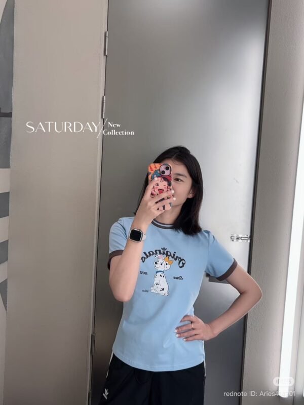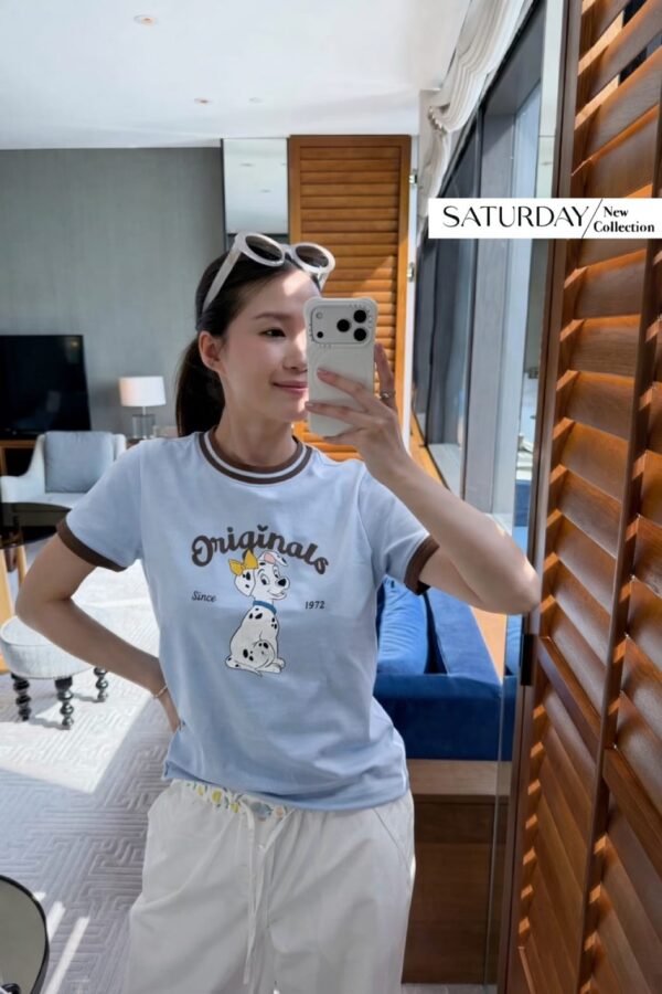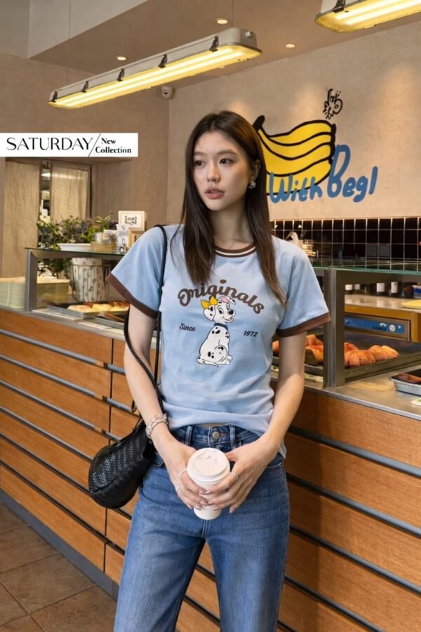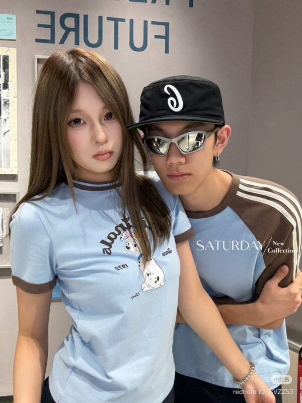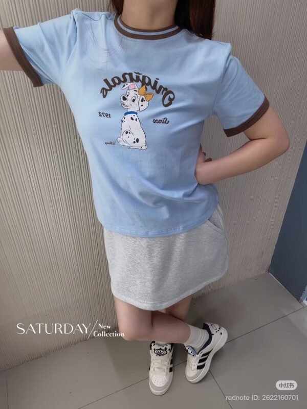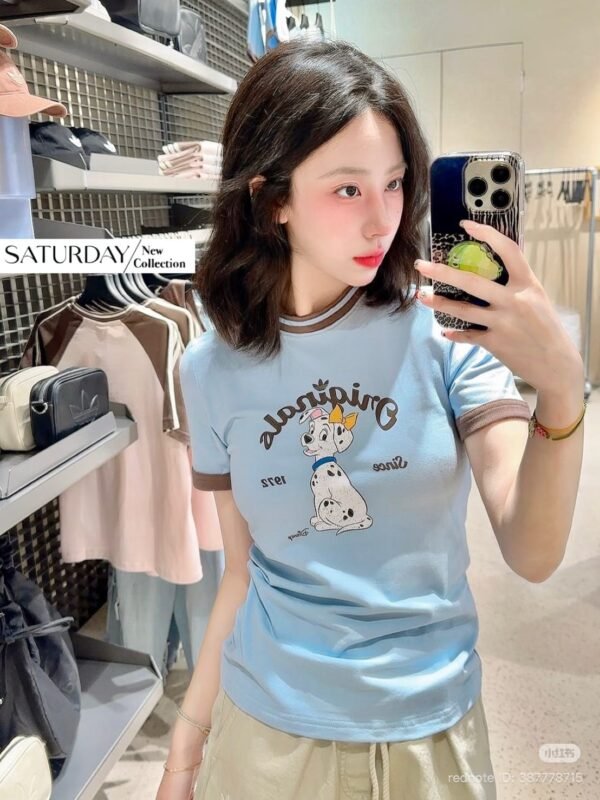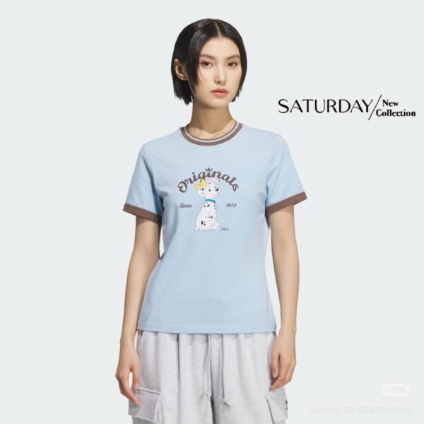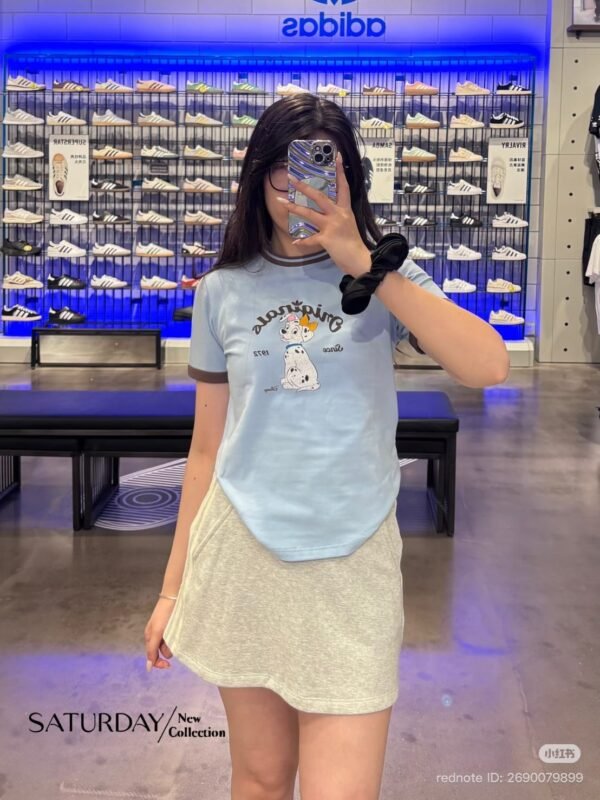 A fitted T-shirt crafted from high-quality fabric, featuring a screen-printed design that is an exact replica of the authentic Adidas x Disney “Dalmatian” collaboration. The piece features ribbed cuffs and neckline, with a print quality that is spot-on. The combination of blue and brown creates a lovely, perfectly balanced look!