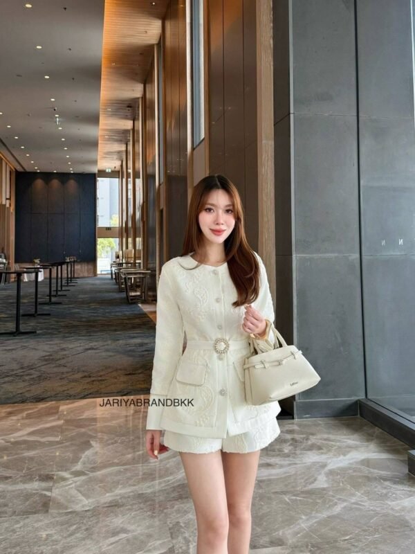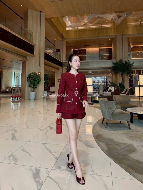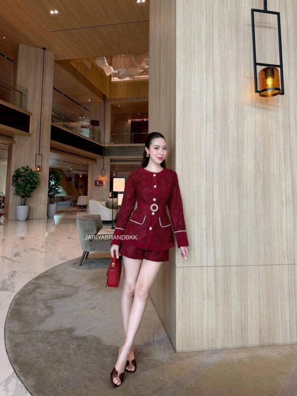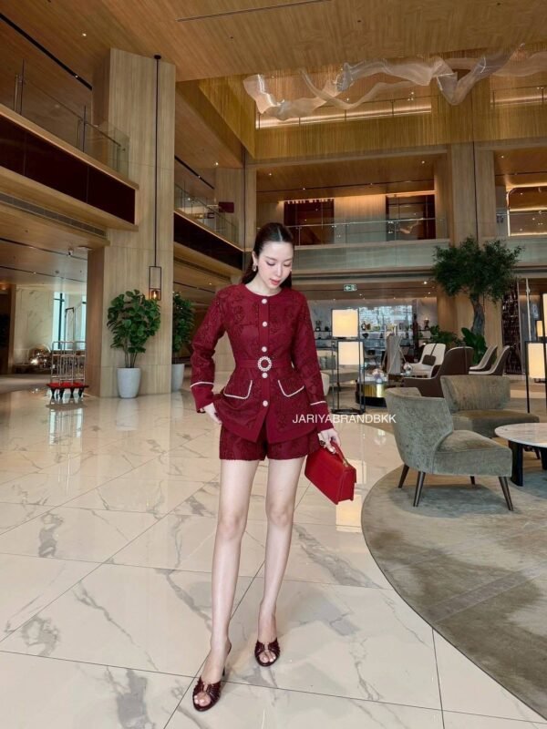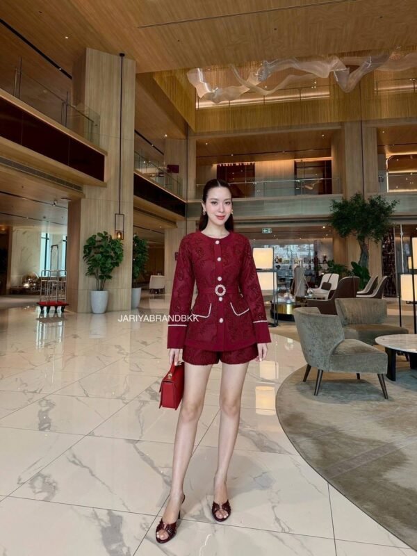 3-piece set (high-quality lace fabric). Round neck, long-sleeved lace top with pockets and rhinestone buttons. Includes a belt. Comes with high-waisted lace shorts. Very beautiful and comfortable to wear. The actual product is even more beautiful than the pictures. The fabric is very soft and comfortable to wear. The cut is flattering and the workmanship is beautiful; it looks very high-end and expensive.