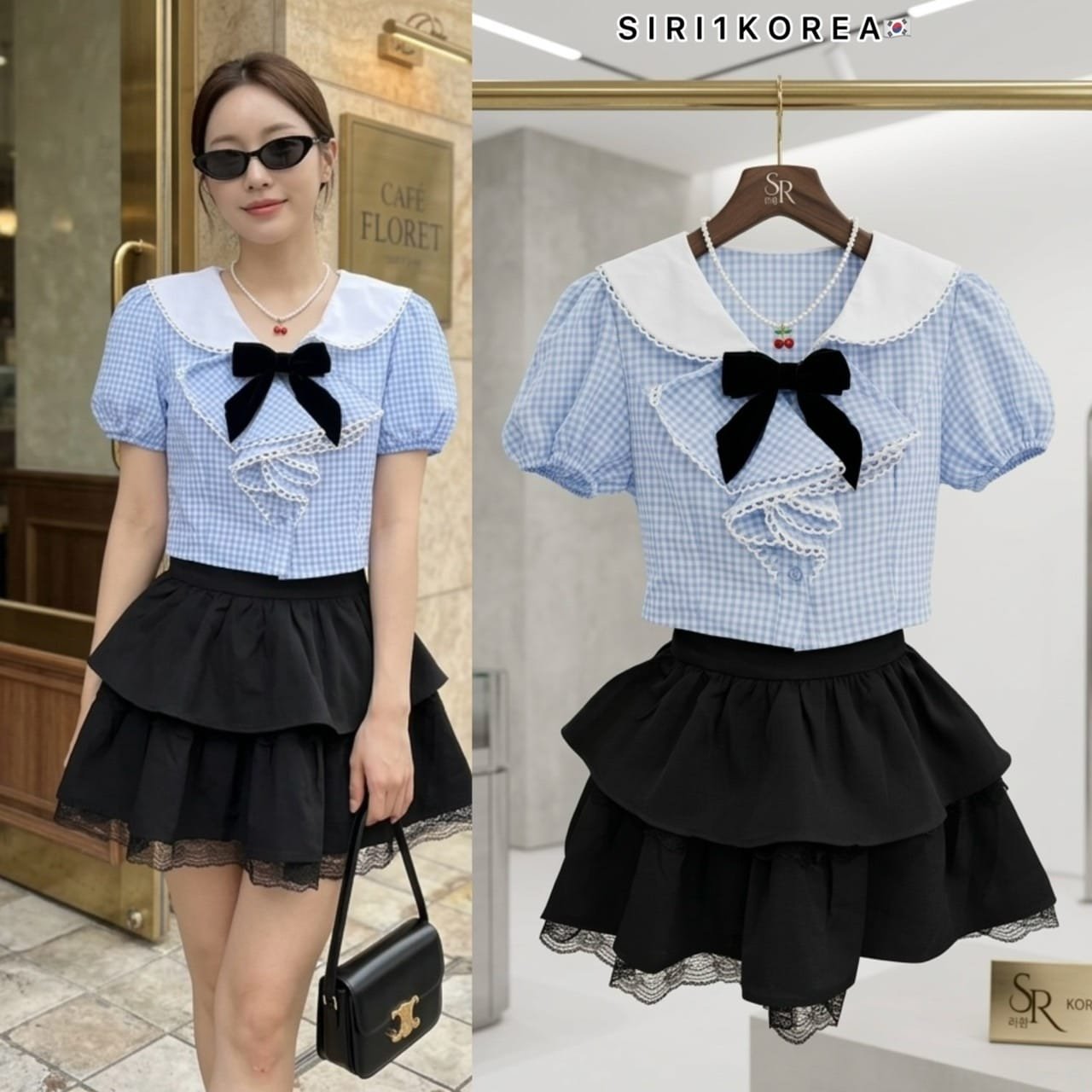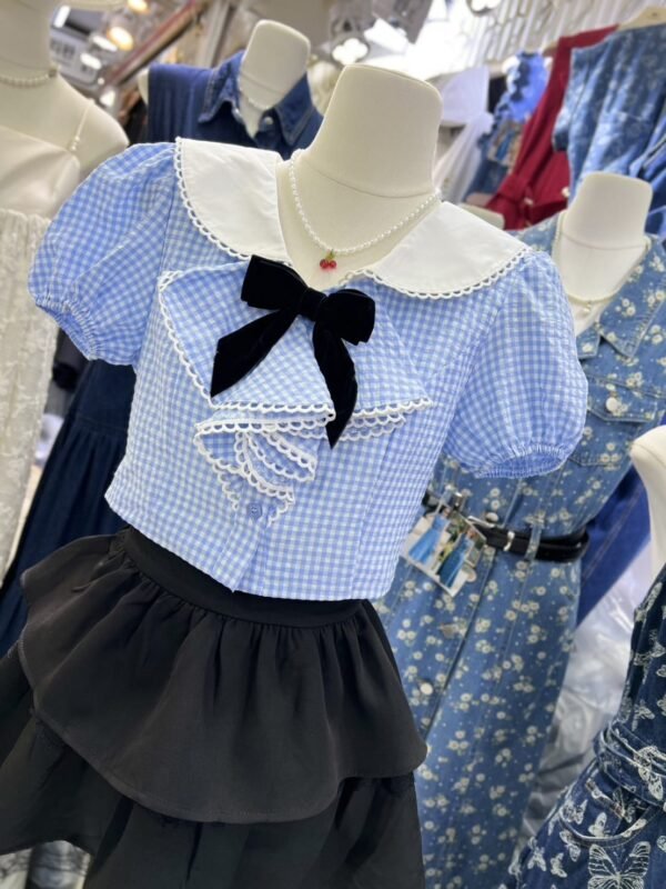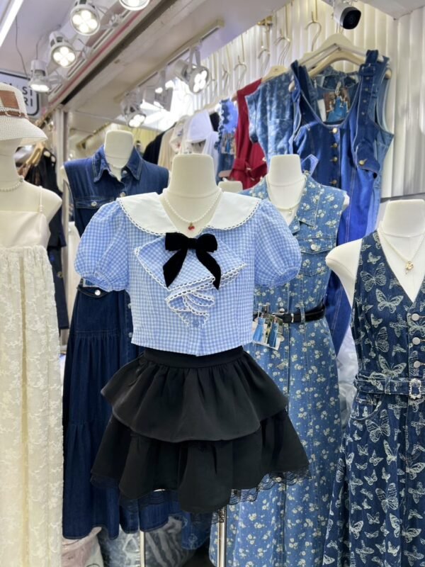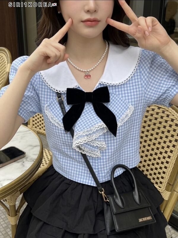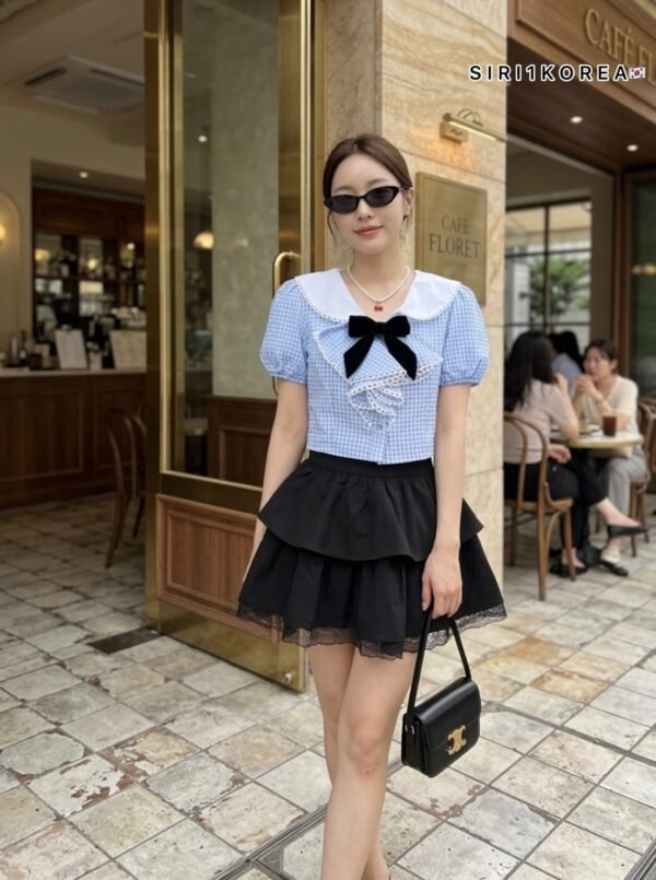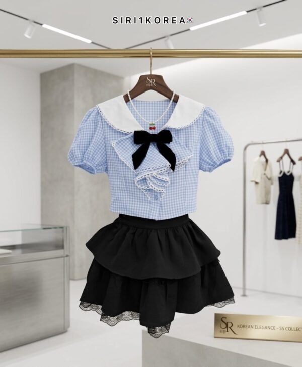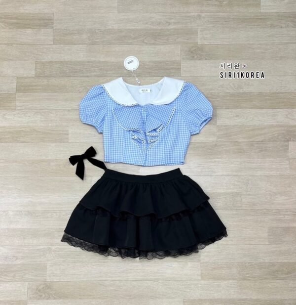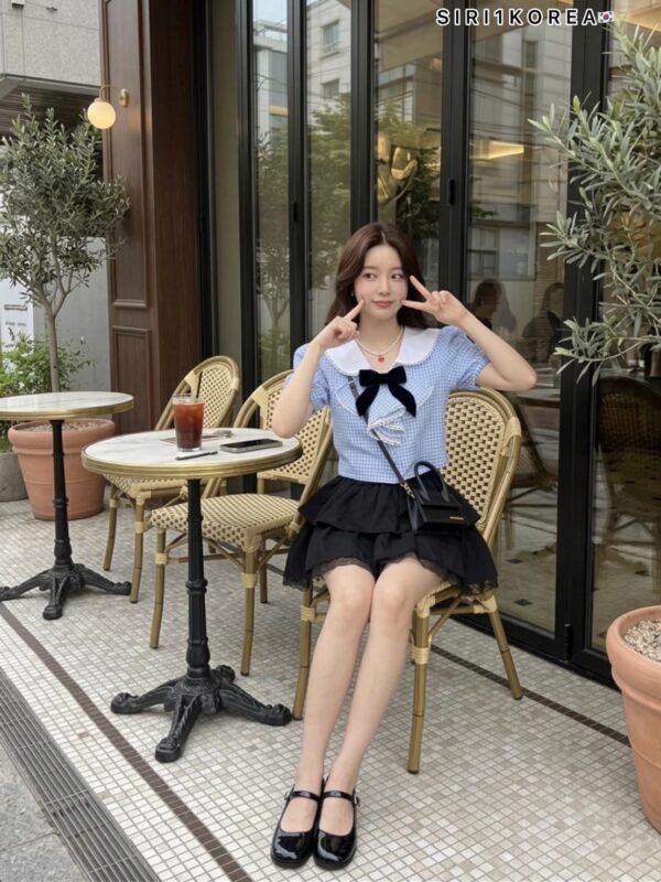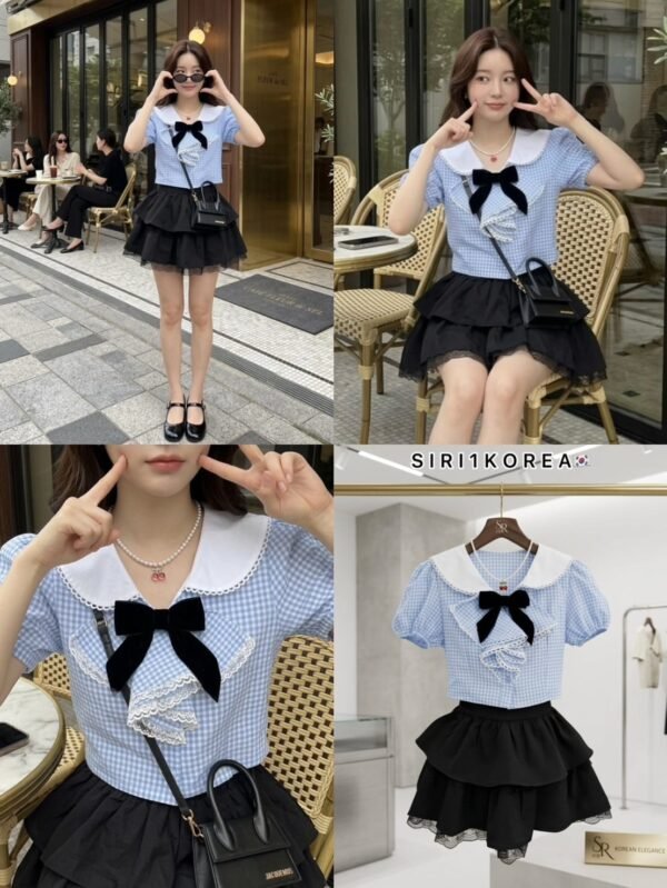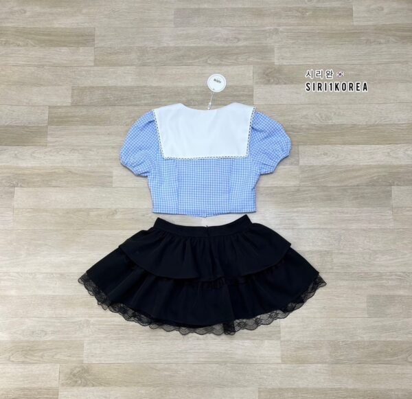3-piece set in Korean style. Includes a puff-sleeved sailor-style top with a collar that also has a back collar detail for added cuteness. The chest is adorned with a ruffled bow and comes with a velvet bow brooch. The skirt has ruffles, is made of good quality fabric, and has a zipper to create the look of shorts. This set is super cute! Beautiful design, perfect fit, and excellent fabric.