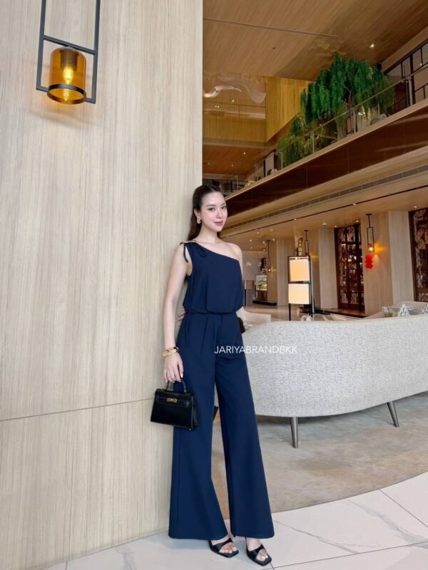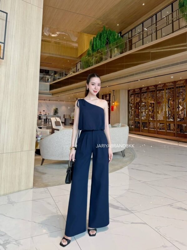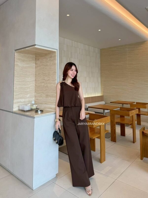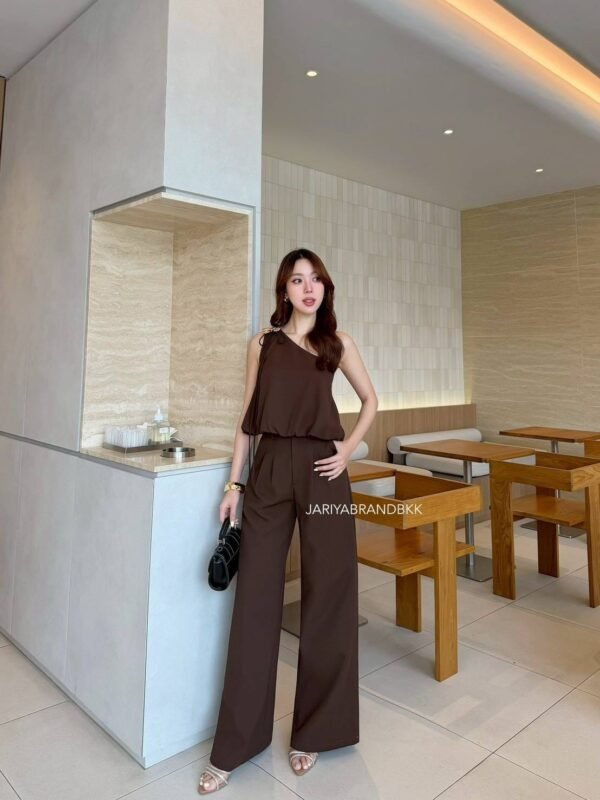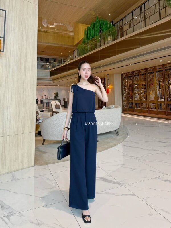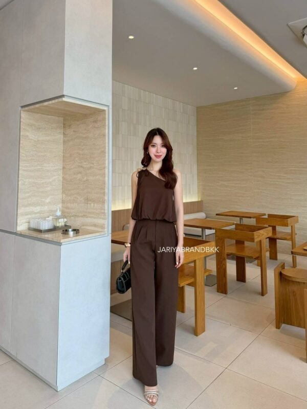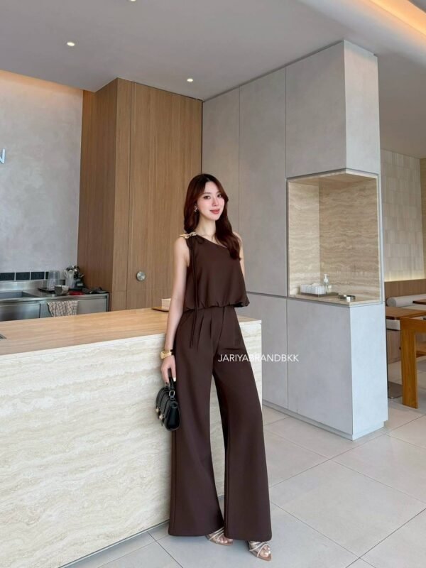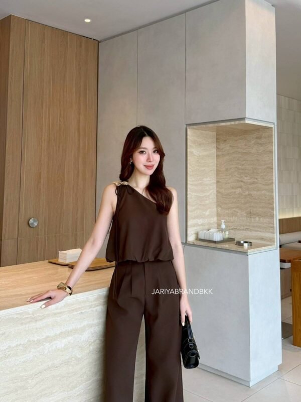 3-piece set (structured suit fabric). Sleeveless top with one-shoulder design and a gold butterfly belt. Comes with beautifully cut long trousers. Very comfortable and stylish. The actual item is even more beautiful than the pictures. The fabric is very soft and comfortable to wear. The cut is flattering and the workmanship is beautiful; it looks very high-end and expensive.