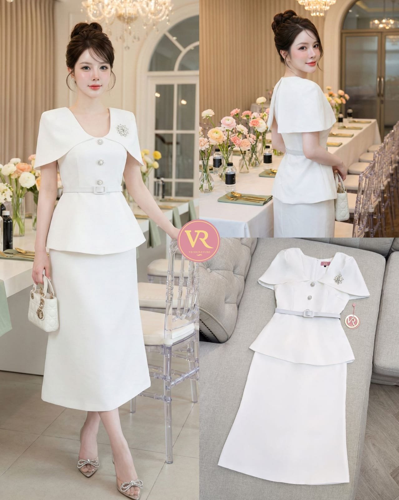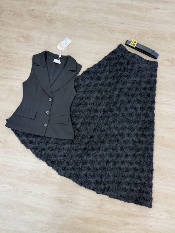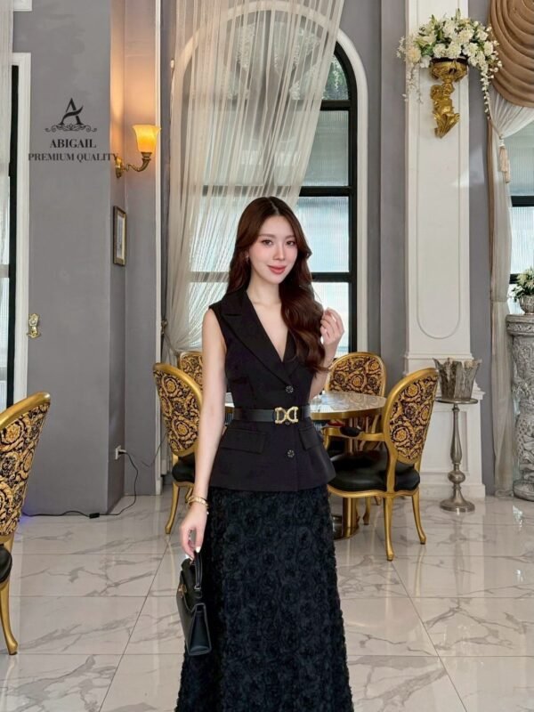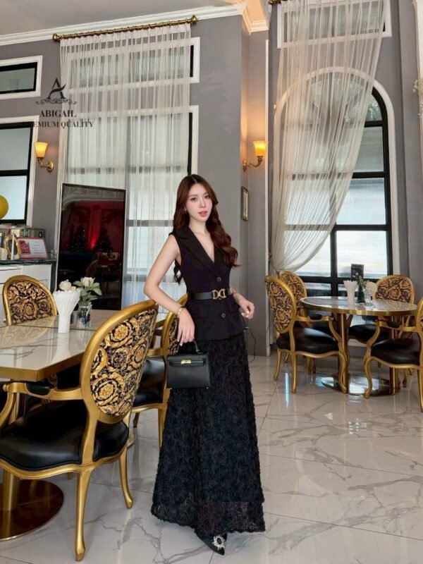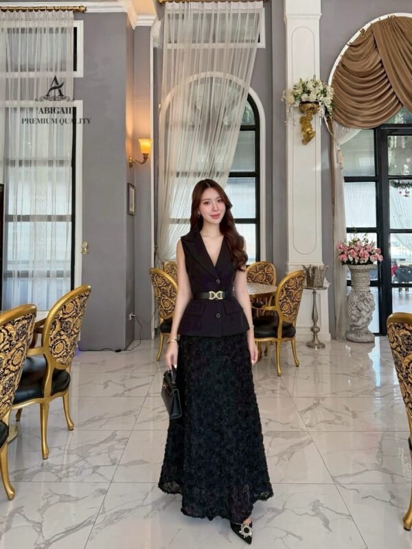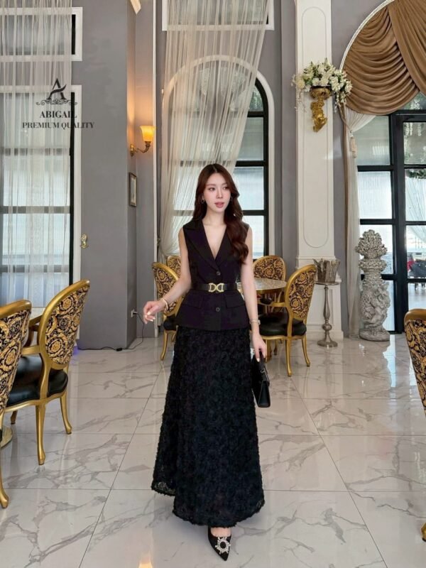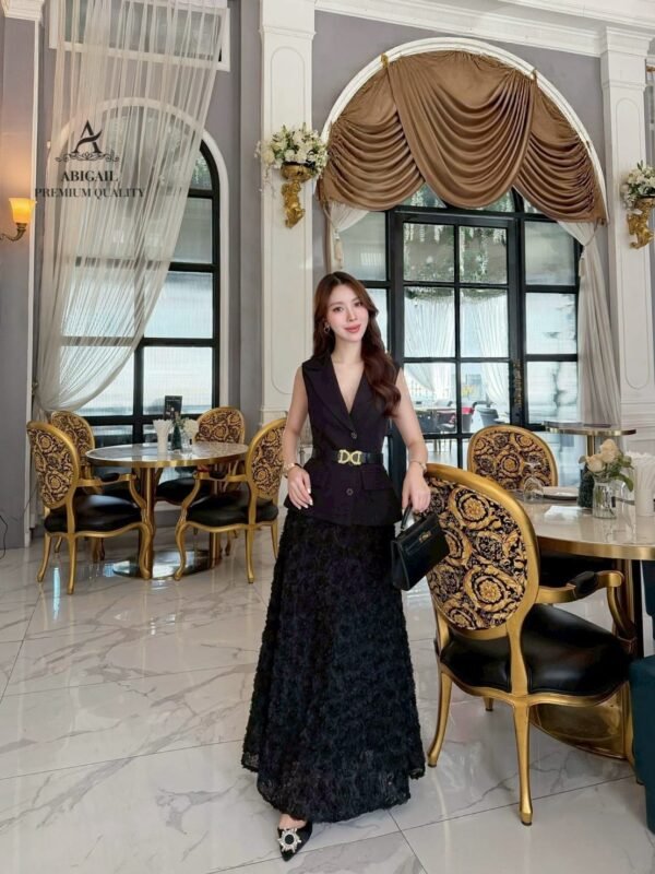 The long skirt is made of 3D lace fabric in classic and harmonious colors, creating a luxurious working woman look. Sophisticated yet stylish, perfect for events, seminars, or fancy dinners. This outfit is sure to turn heads.