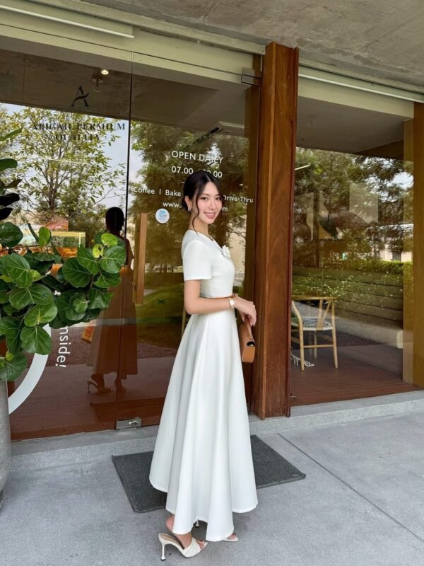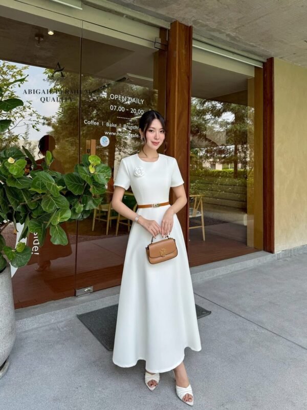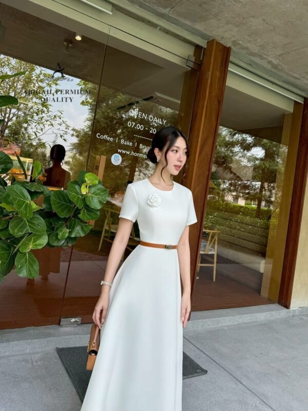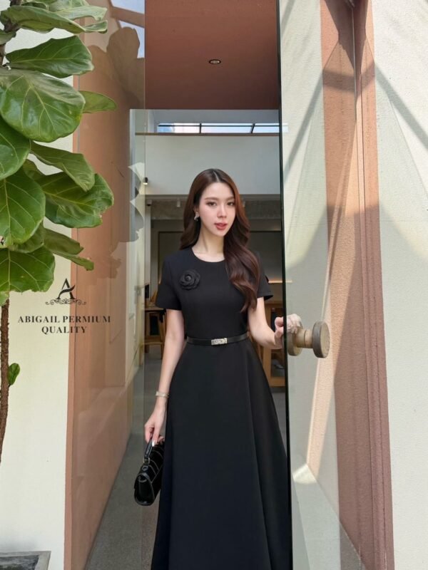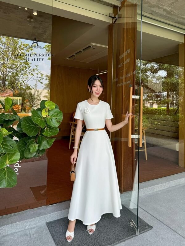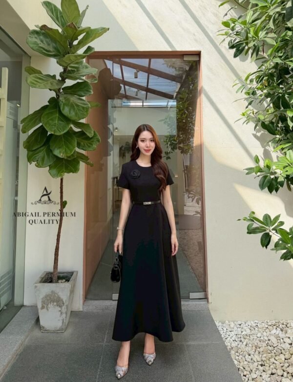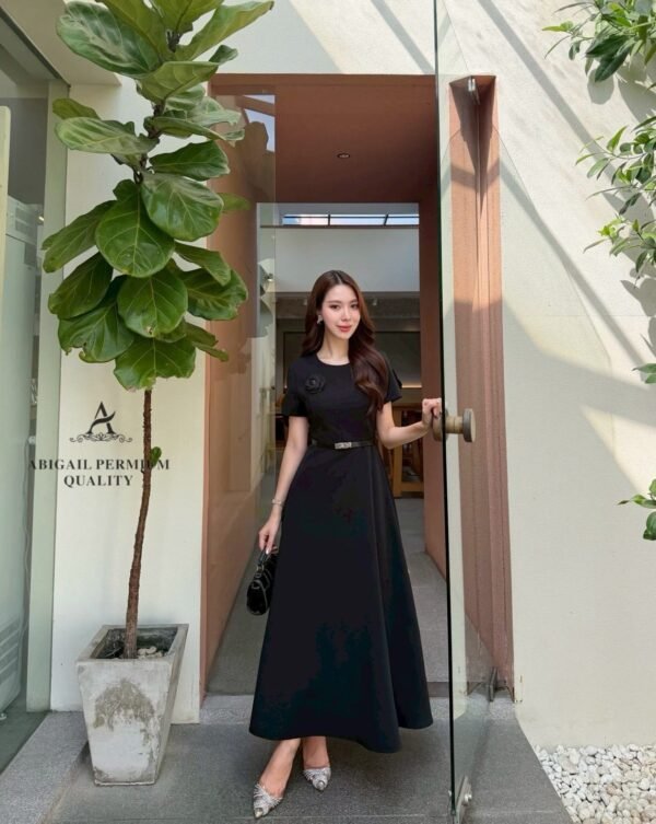 3-piece set: Short-sleeved, round-neck dress with a flower brooch on the chest, comes with a belt. Stunning and elegant, this set is made from beautiful, high-quality fabric. Suitable for all occasions. A must-have in your wardrobe!