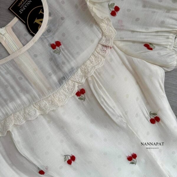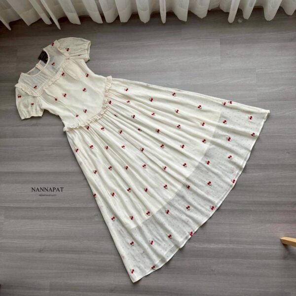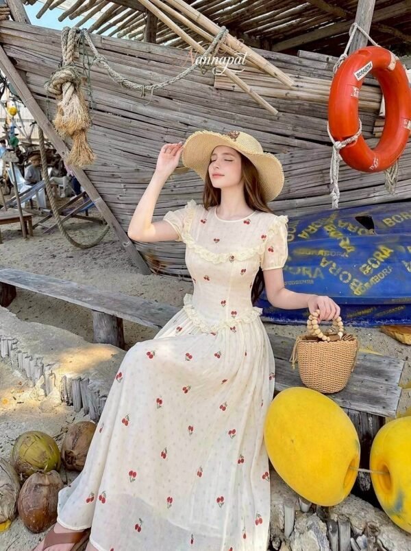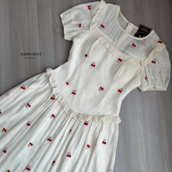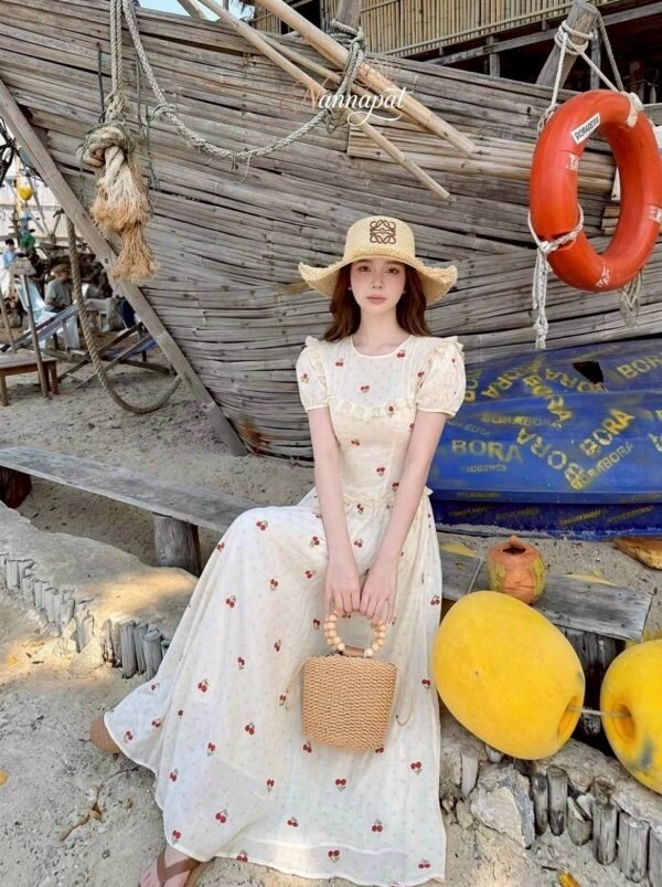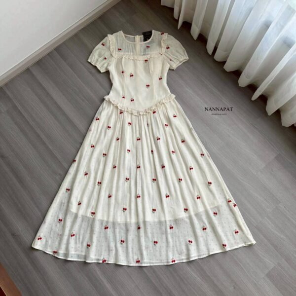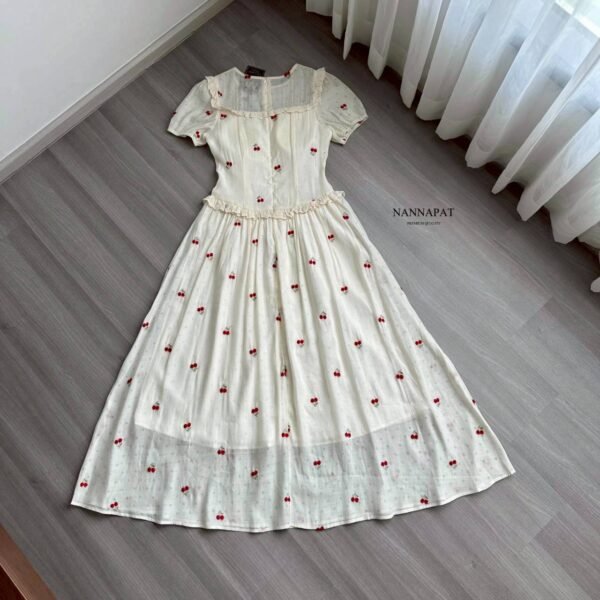 “A long dress featuring a unique neckline—a blend of round and square styles—accented with sheer fabric details and exquisite, intricate pleating on the upper bodice. Crafted from a cream/off-white fabric base, it features a subtle, woven polka-dot texture embedded within the material itself. The fabric is lightweight, airy, and drapes beautifully, ensuring maximum comfort without feeling hot or stifling. The design stands out with delicate embroidery of red cherries and green stems scattered across the entire garment. It features charming puff sleeves finished with ruffled lace trim—a clever detail that helps flatter and conceal the upper arms. Additional ruffled lace trim adorns the bust and waistlines, helping to accentuate your figure and create a shapely silhouette. Fully lined with high-quality material throughout, so there is absolutely no need to worry about transparency. Includes a discreet hidden zipper at the back for easy dressing. Simply grab a woven basket bag to match, and your look is complete!” Ladies, this is a true “must-have” item! You’ll definitely regret it if you miss out!