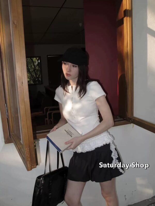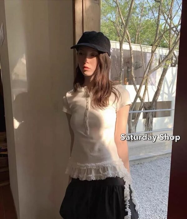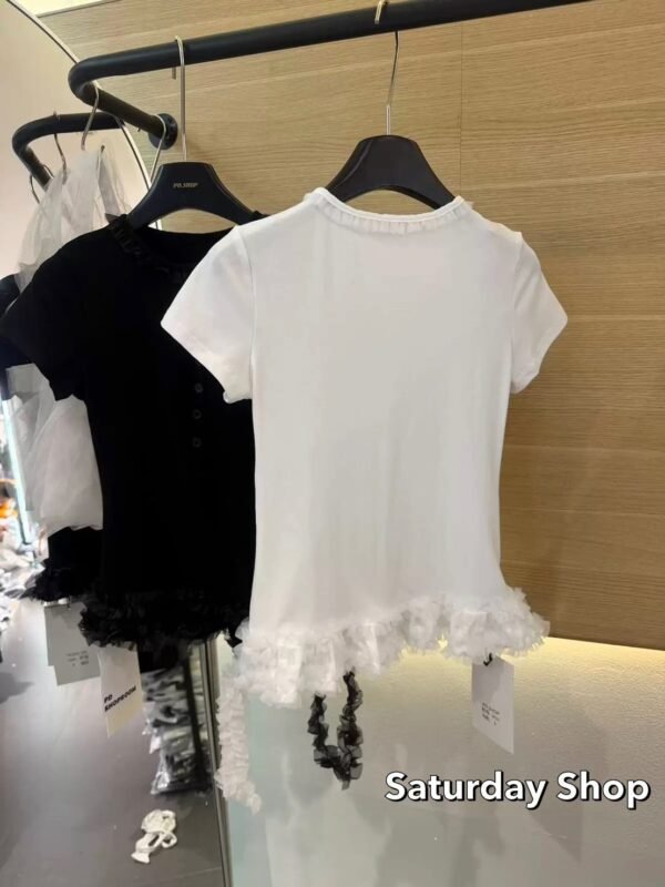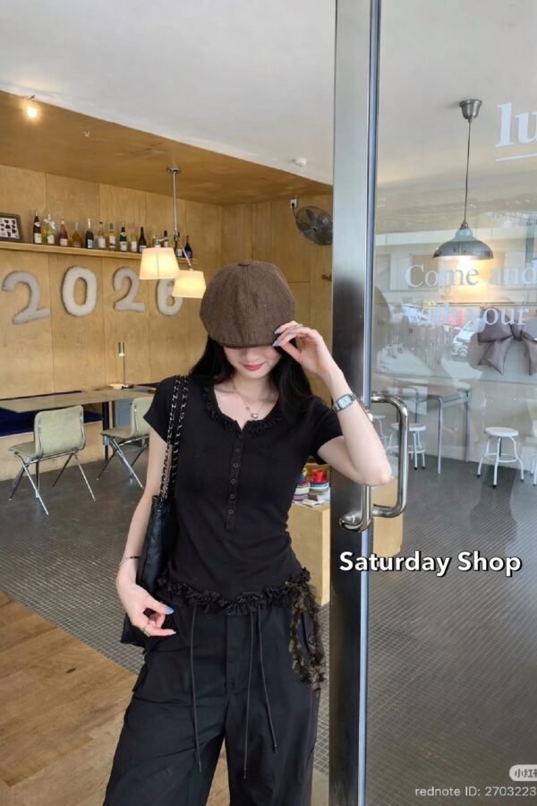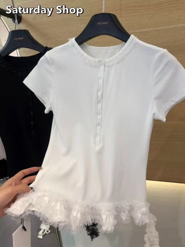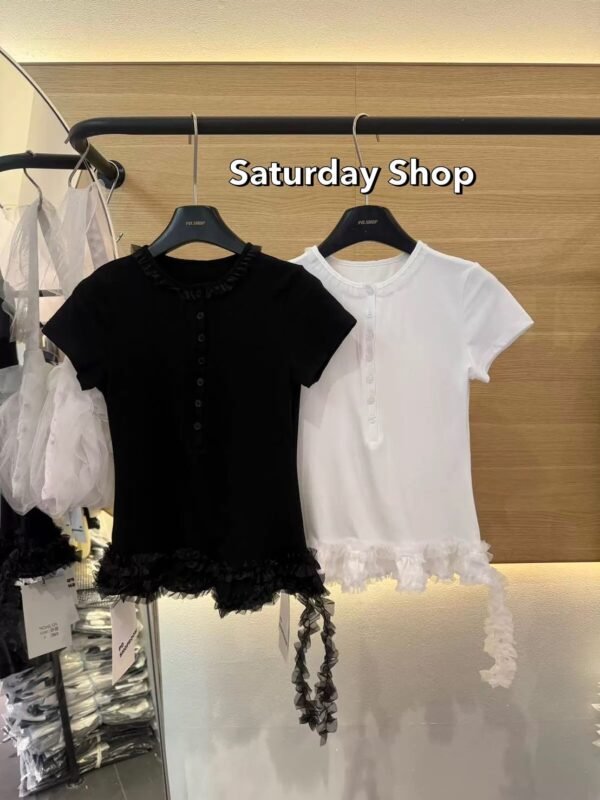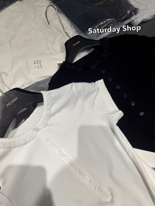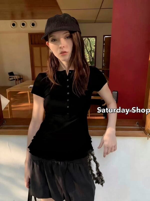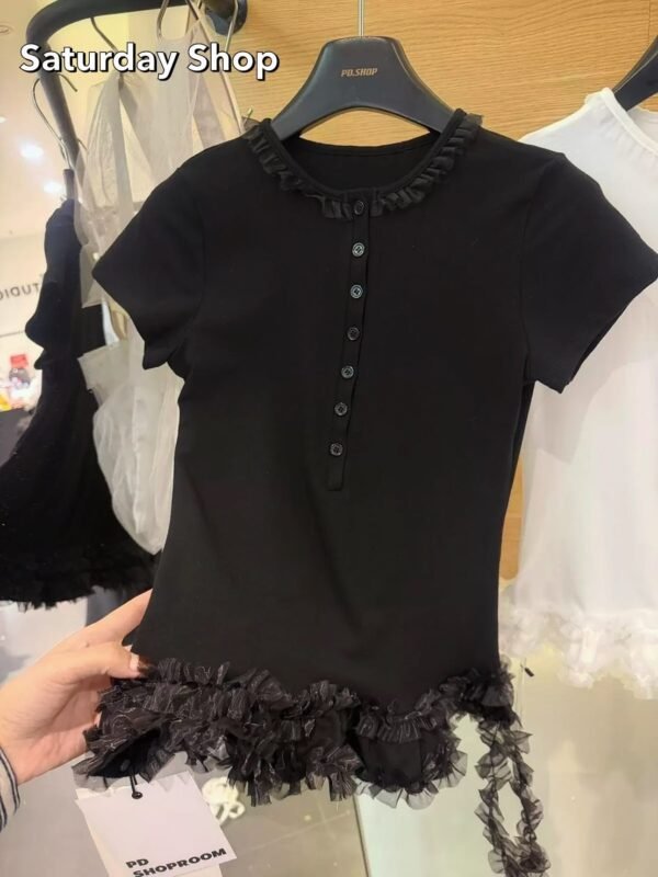 A ribbed knit top featuring exceptional stretch and supreme comfort. The design details include a row of functional buttons down the front—each one fully unbuttonable—and a chic, layered ruffle hem. Easily mix and match with any style of trousers to suit your personal taste!