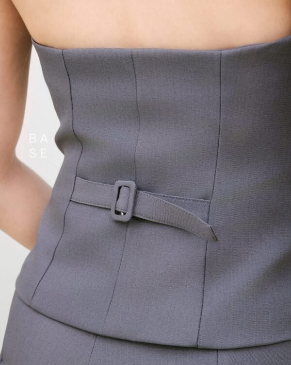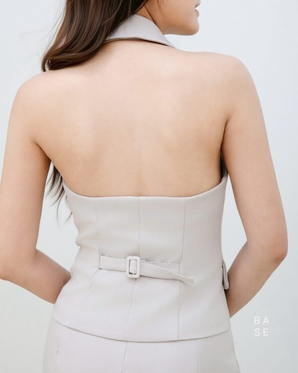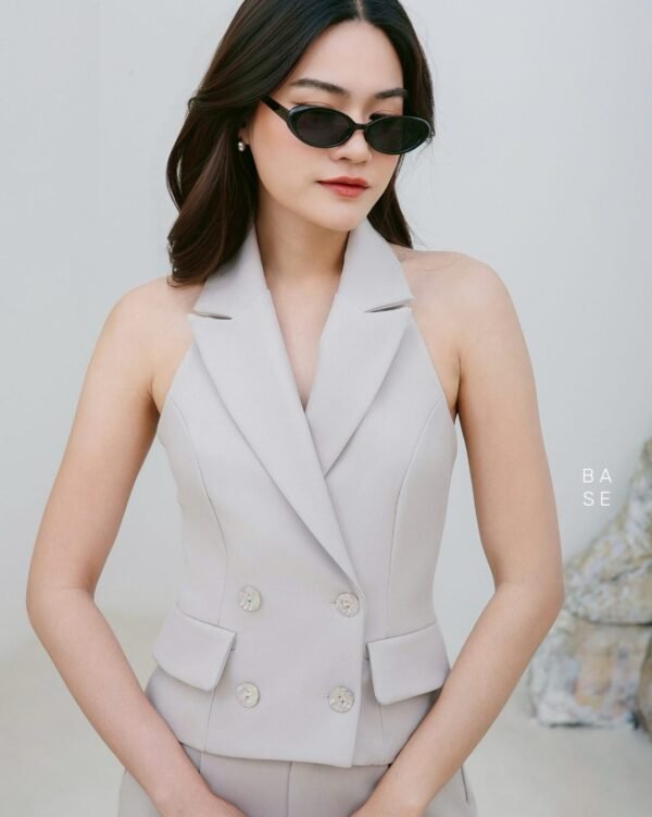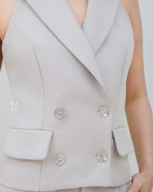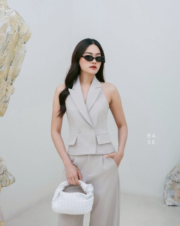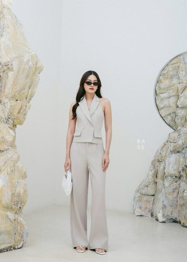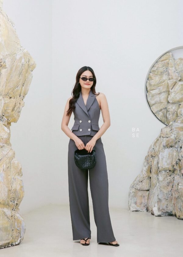 a tailored double-breasted button design for a polished look. The fitted waist creates a flattering silhouette. Comes with matching basic long trousers. This set creates a sophisticated and elegant look, perfect for any occasion.