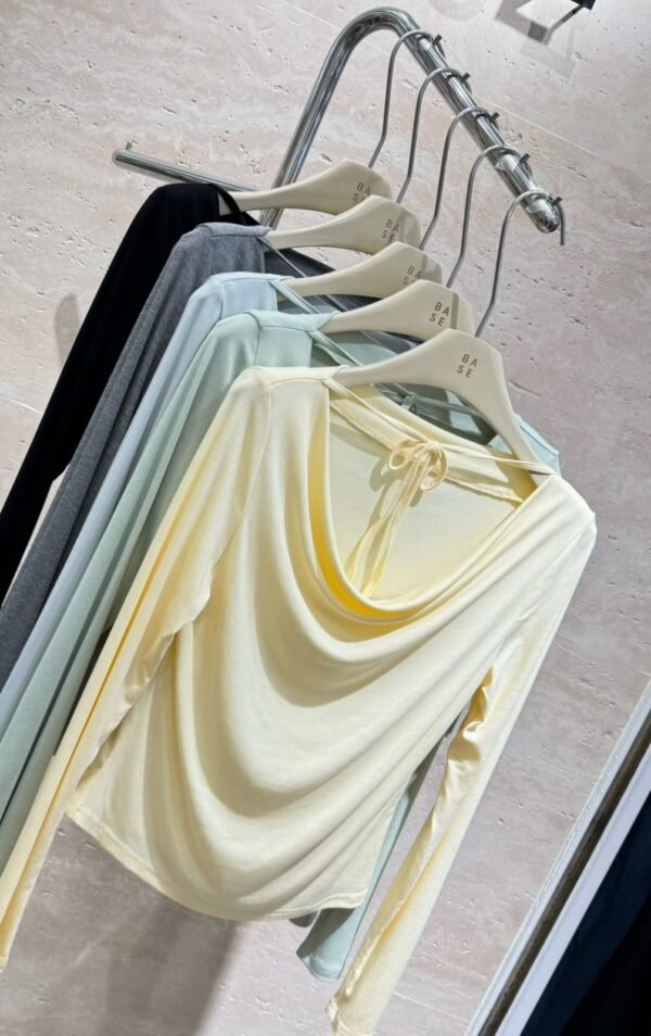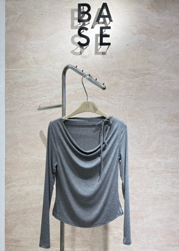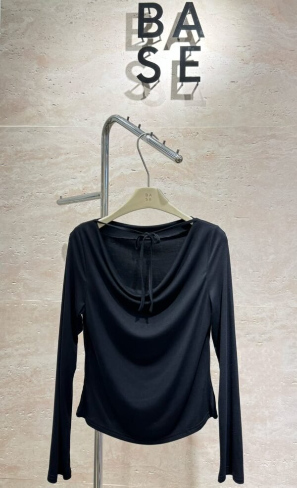 with a draped neckline and drawstring detail that can be tied at the front or back. Stretchy and comfortable fabric.
