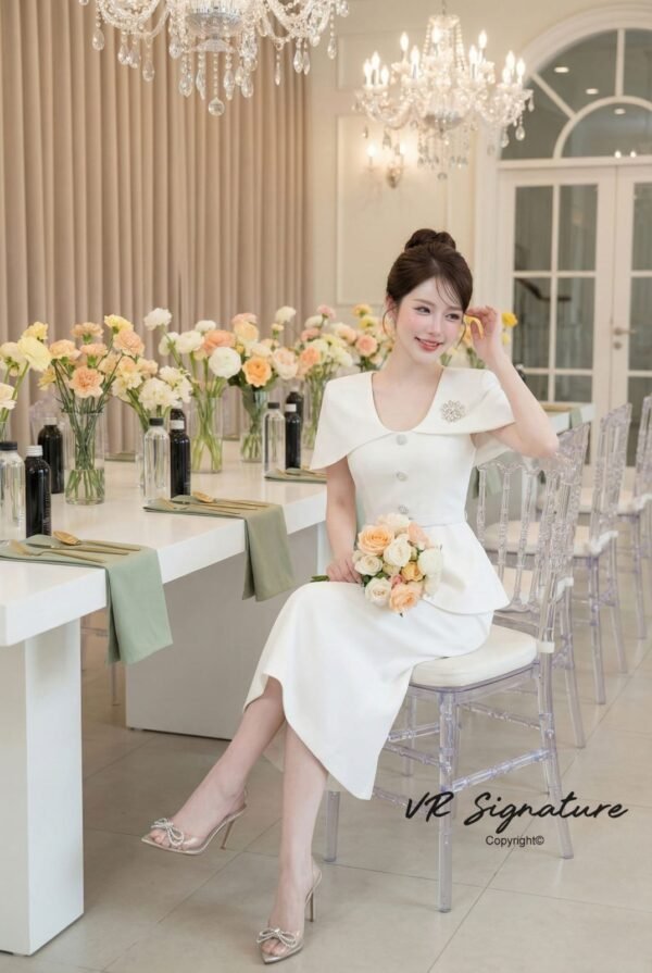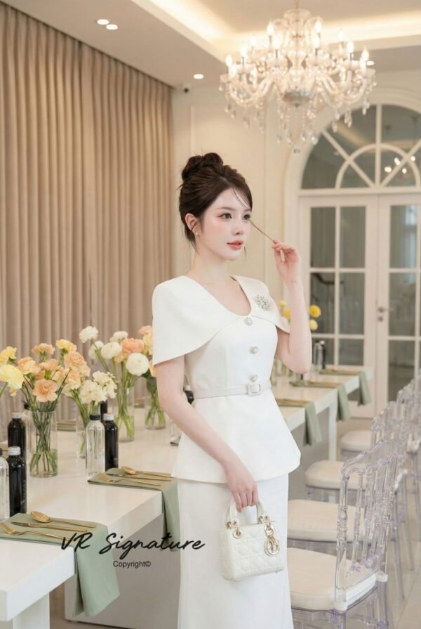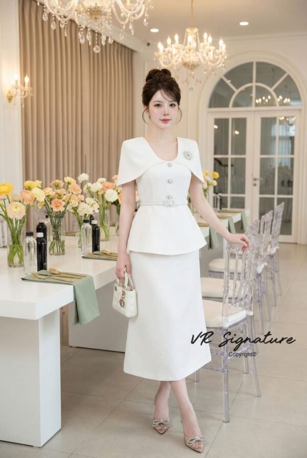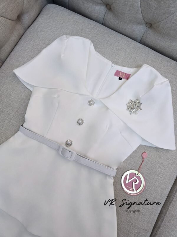 button front closure, slightly flared hem, fitted waist with matching belt, and a slight flare at the back. Features a slit and a decorative brooch on the chest for added glamour. Thick, structured fabric with full lining. … Stunning fit and impeccable pattern. Suitable for all occasions!
