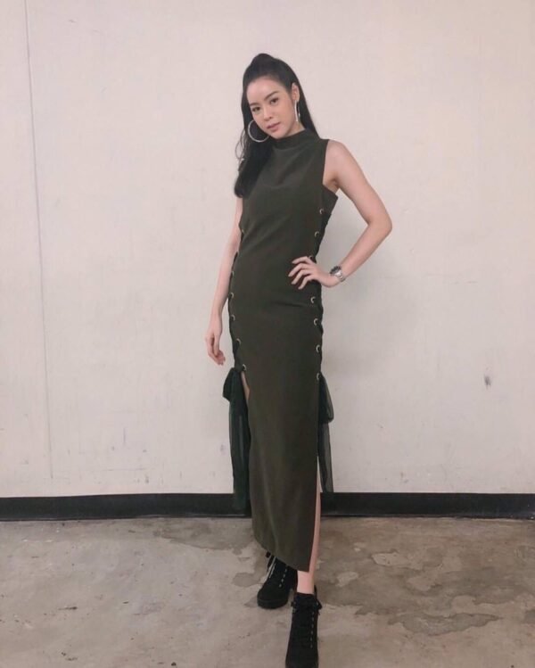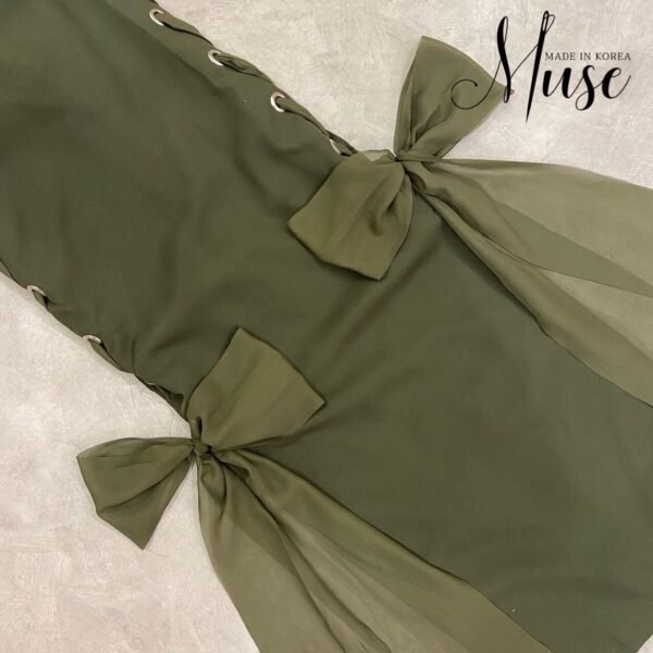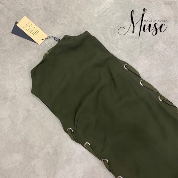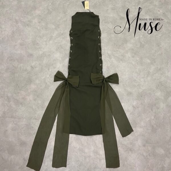 Sleeveless green dress with eyelet and lacing detail on the sides. The hem ties into a bow. A unique and stylish look!