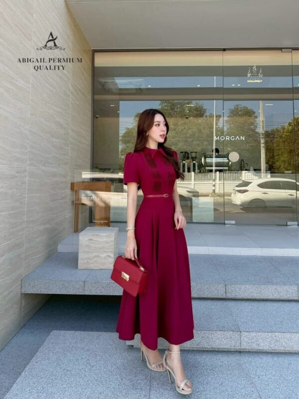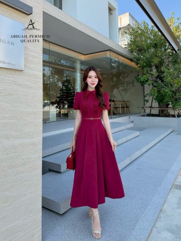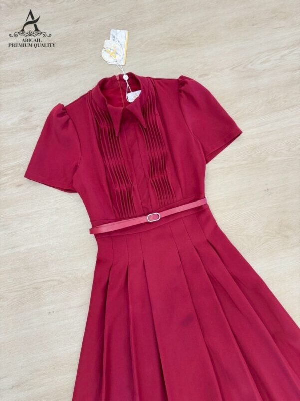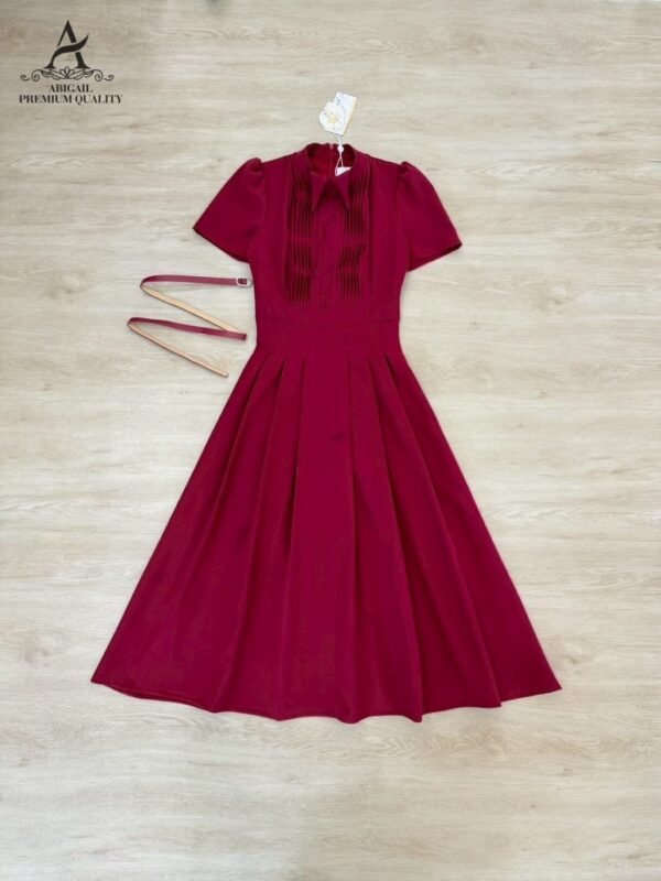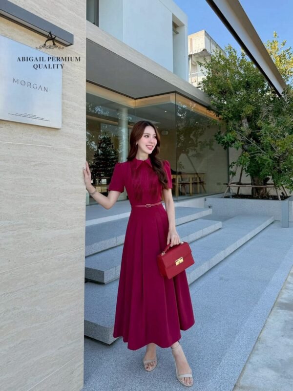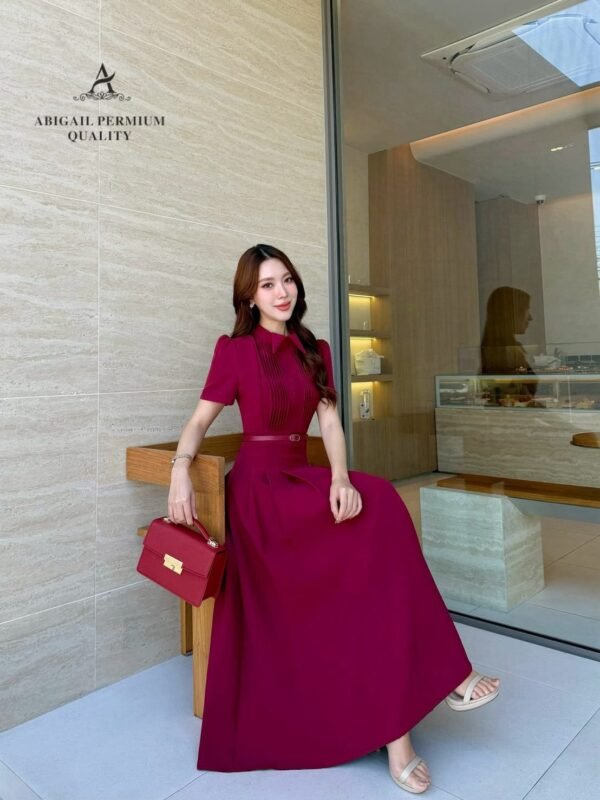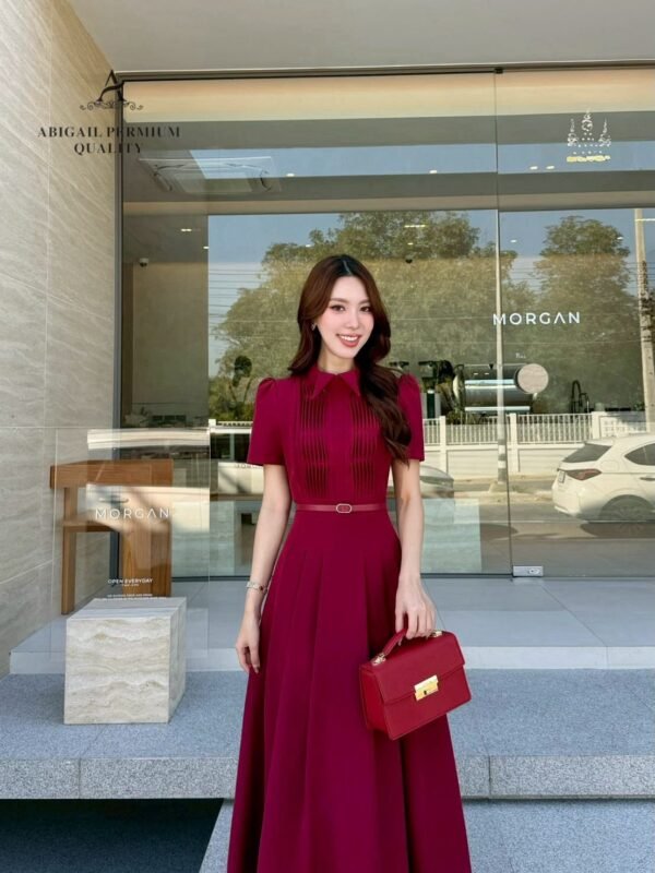 🤍 Long, short-sleeved dress with a collar. The bodice features long pleats. The dress has a flared A-line silhouette with gathered details. The fabric is weighty, drapes beautifully, and is wrinkle-resistant. A matching round buckle belt cinches the waist. Perfect for cafes or special occasions, suitable for both daytime and nighttime events. A complete, effortlessly elegant and sophisticated look.