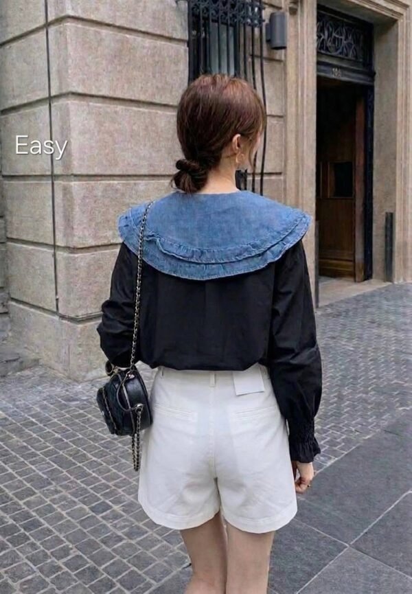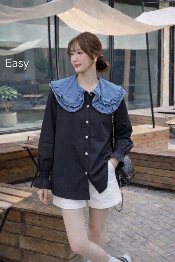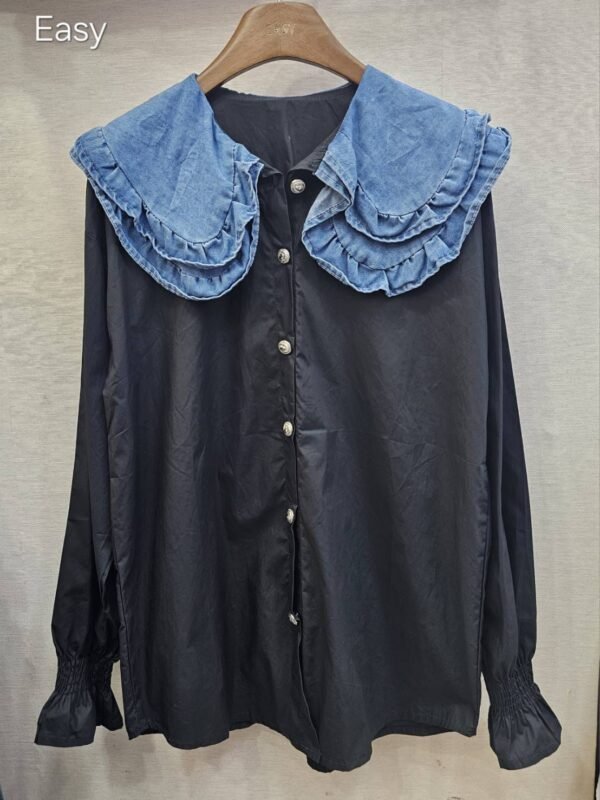 Layered denim collar shirt with ruffles around the edges for a unique and stylish look.