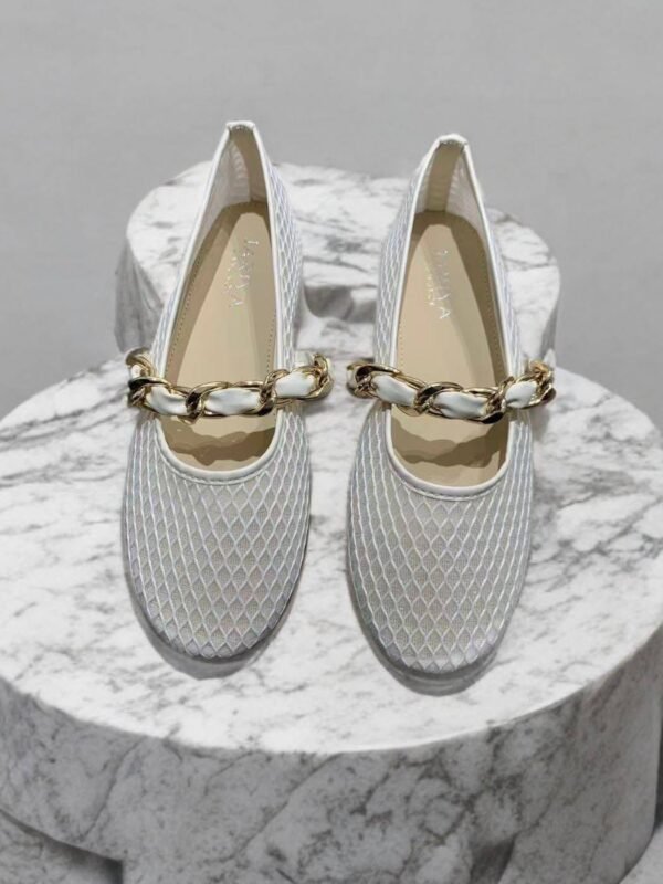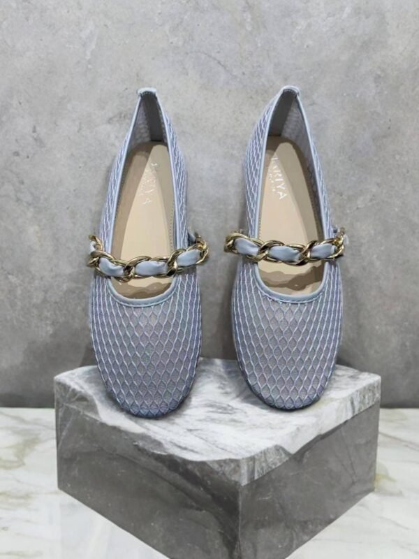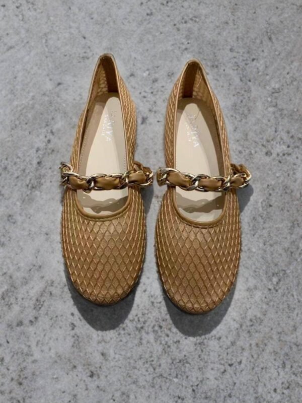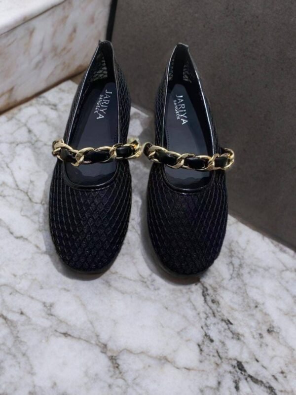 These are court shoes with a gold chain strap across the front (embroidered fabric material). They are elegant and sophisticated, perfect for any occasion and match any outfit. The shoes have been carefully quality controlled and are made with a soft, comfortable sole and beautiful shape. (Product comes with complete box)