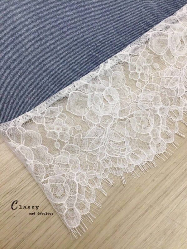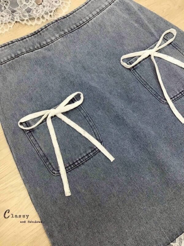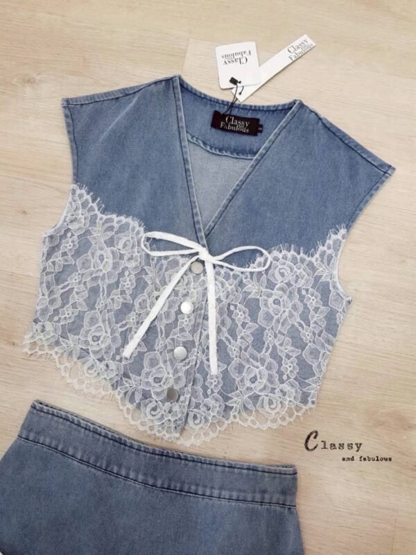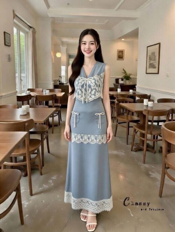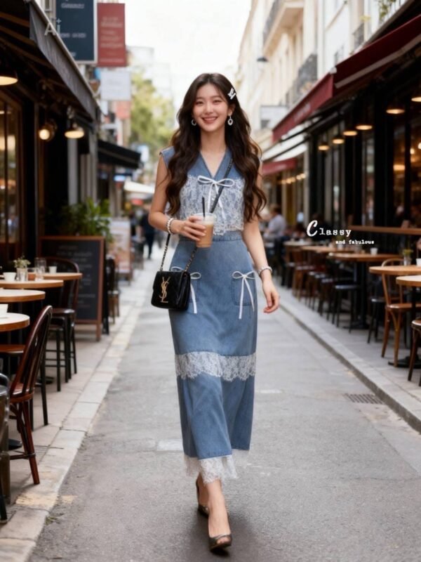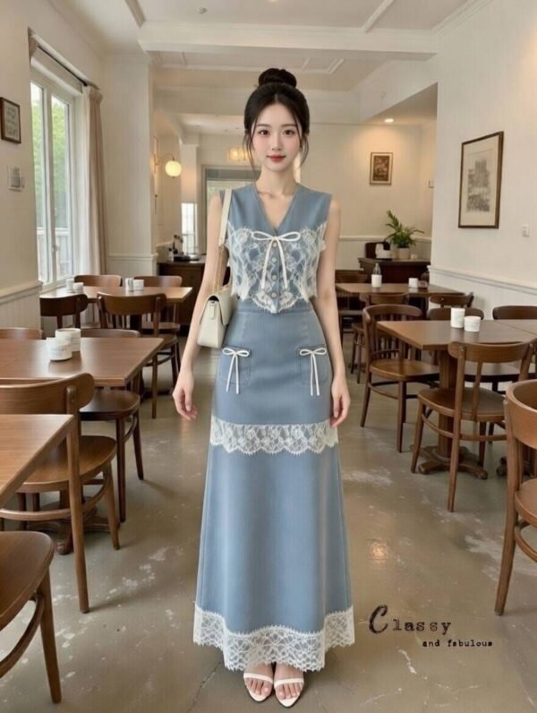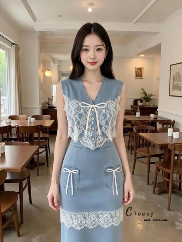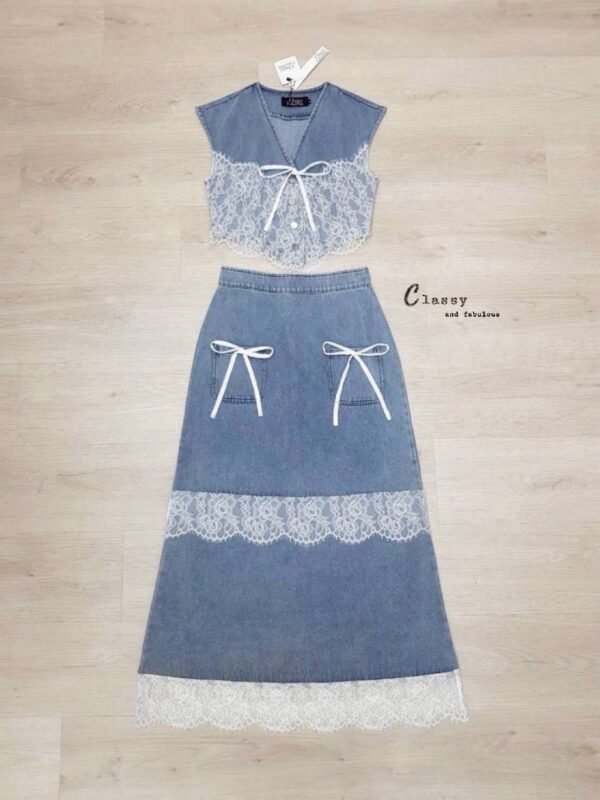 The sleeveless V-neck denim top is made of denim fabric with beautiful lace detailing. It has a V-shaped design with functional front buttons and a white bow tie at the chest. It’s paired with a long denim skirt with a back zipper, front pockets with white bows, and beautiful lace trim at the hem. Perfect for any occasion. So cute!