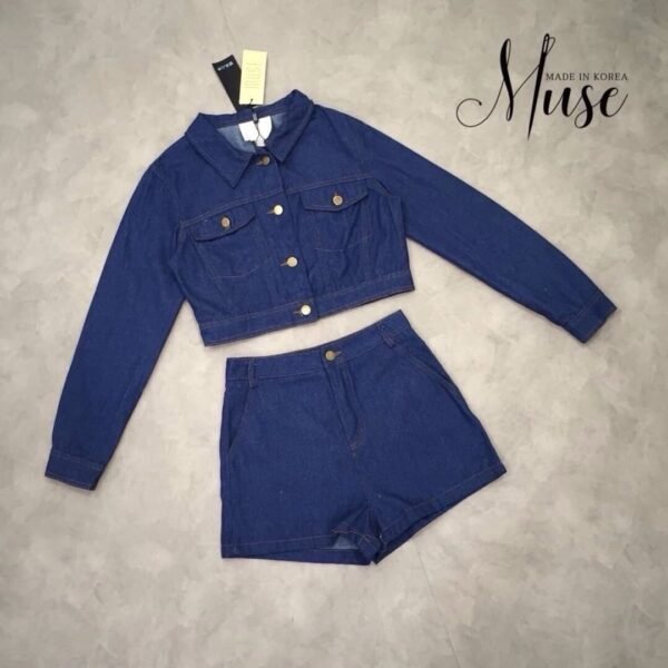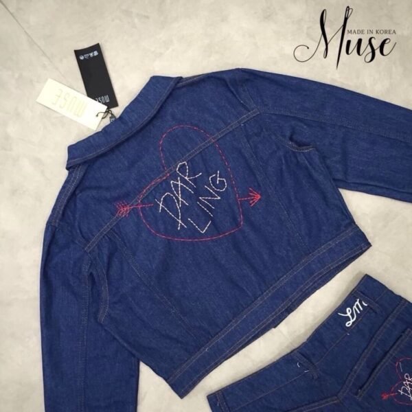 LM Set includes a long-sleeved denim jacket with double front pockets and embroidered details on the back, and matching shorts. Don’t miss out!