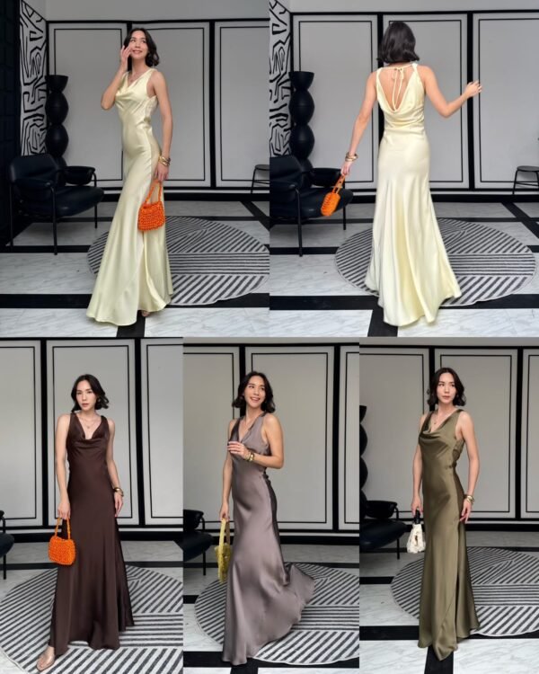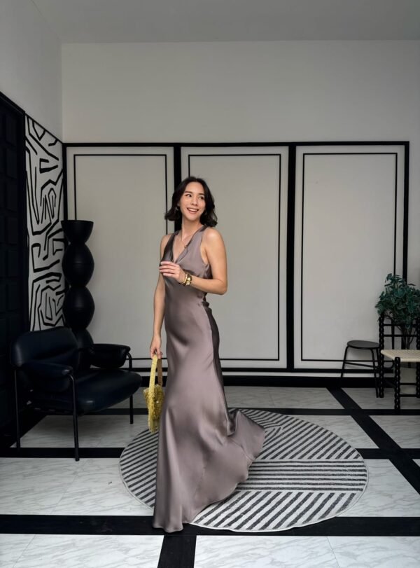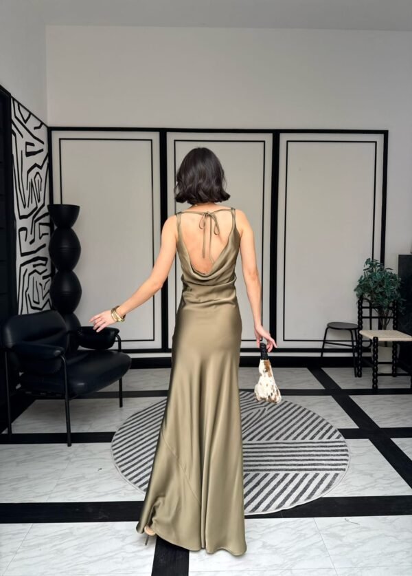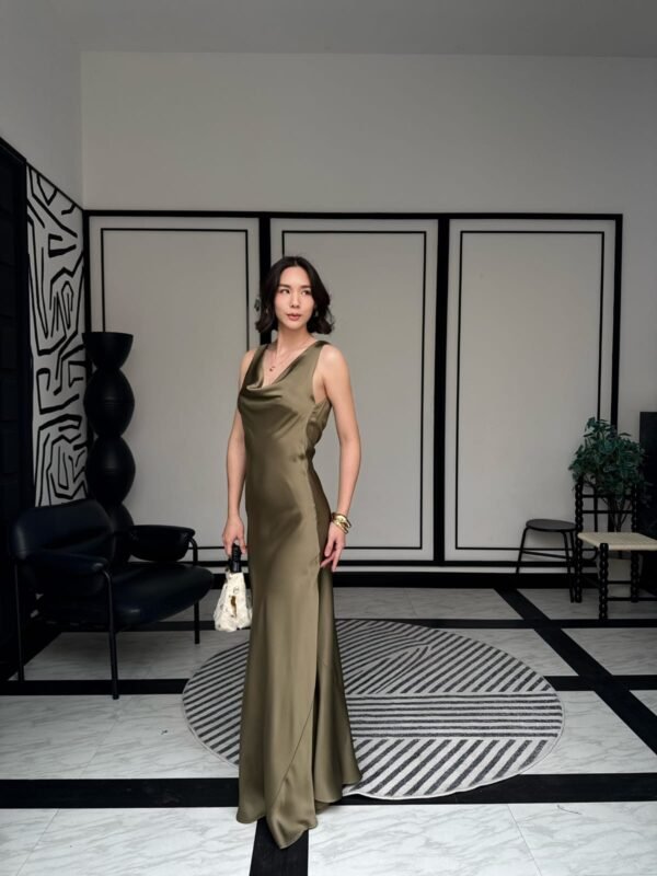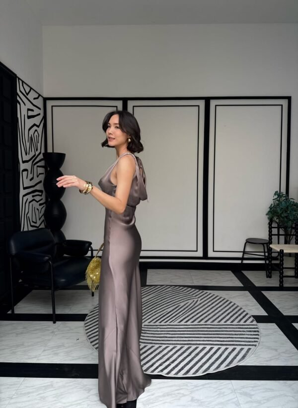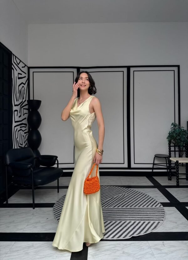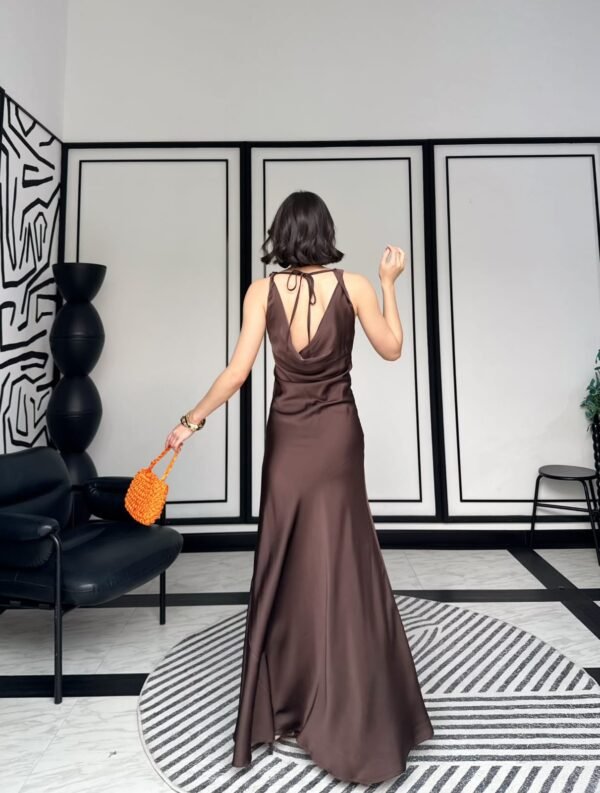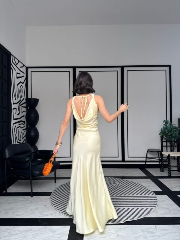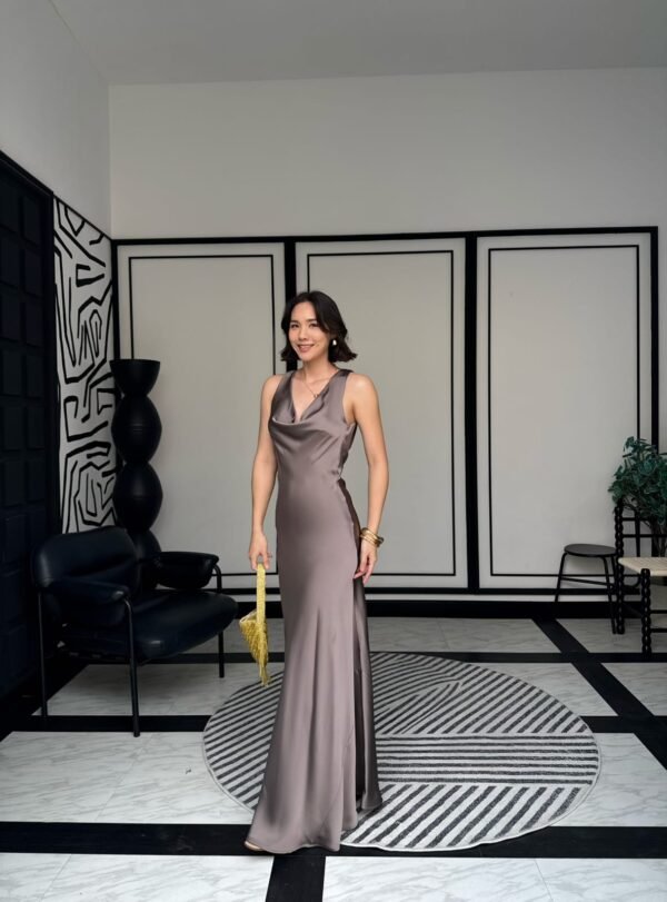 Long dress with a draped neckline front and back, tie-back closure, curled waist, and fishtail hem. Made of lightweight, flowing satin fabric.