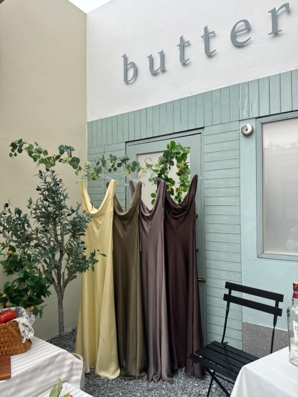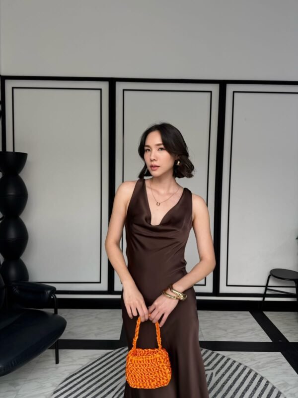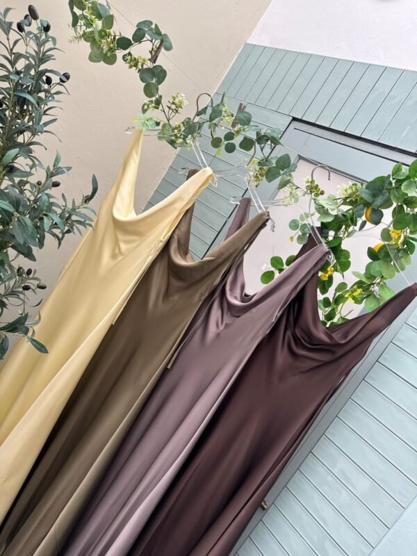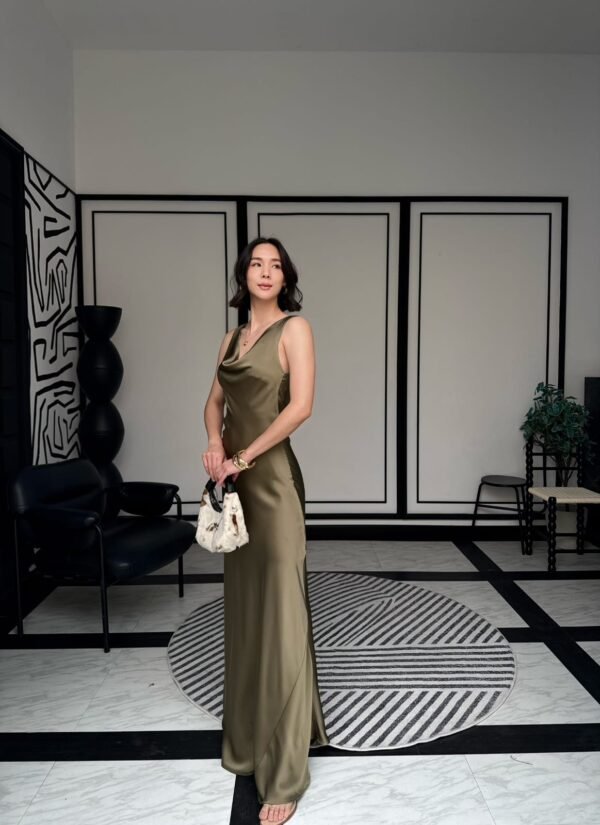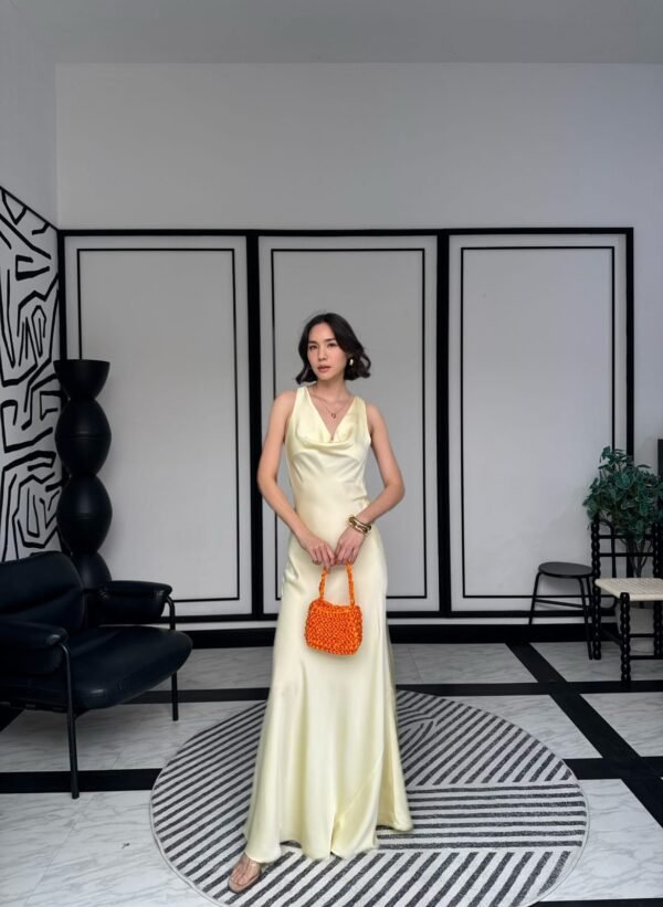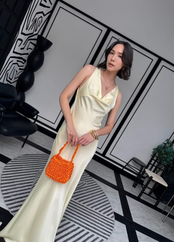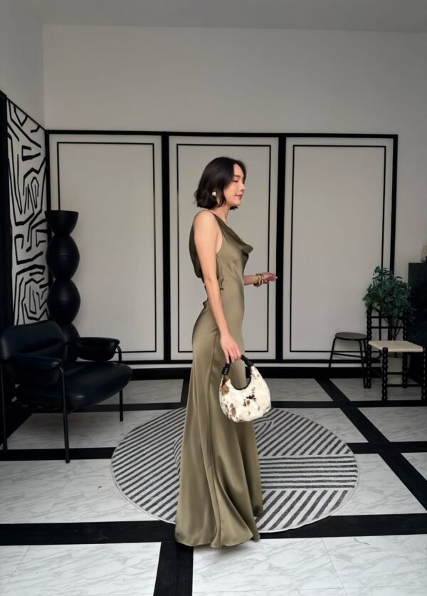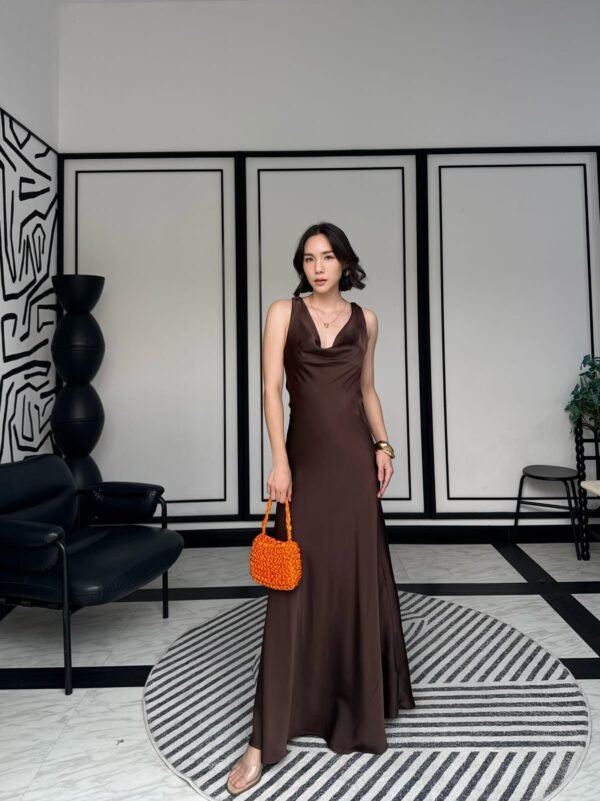 Long dress with a draped neckline front and back, tie-back closure, curled waist, and fishtail hem. Made of lightweight, flowing satin fabric.
