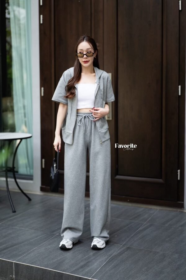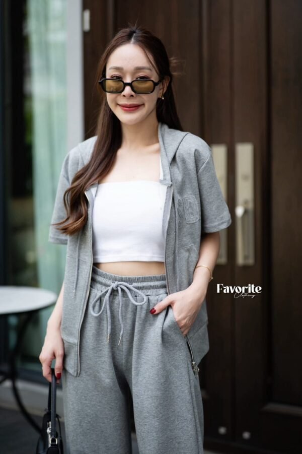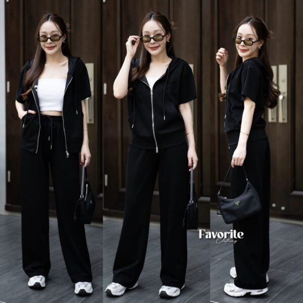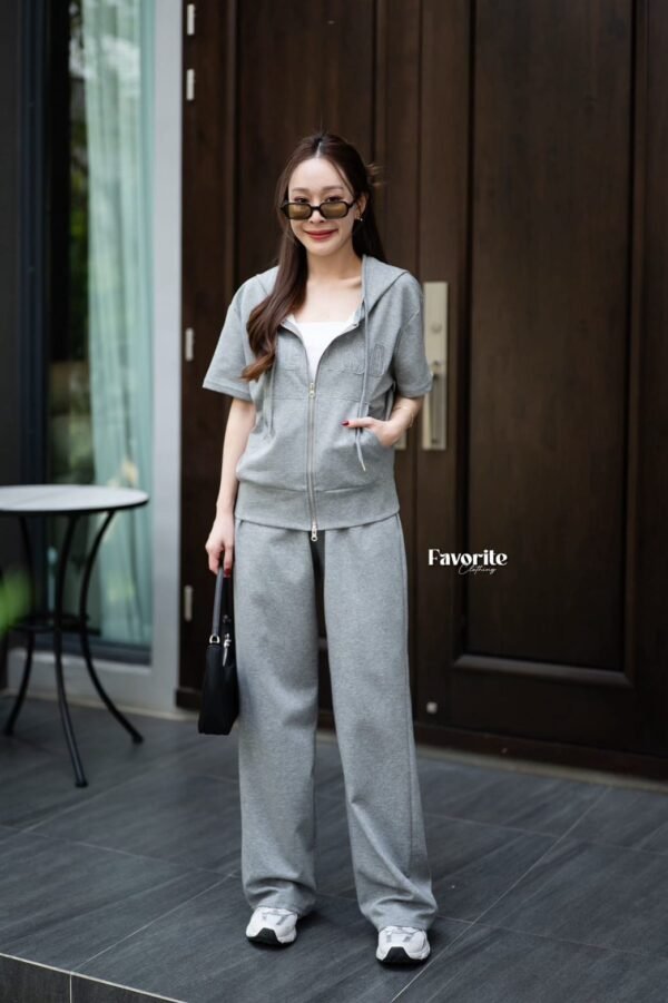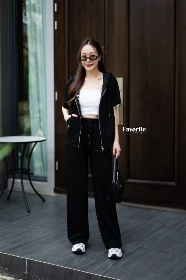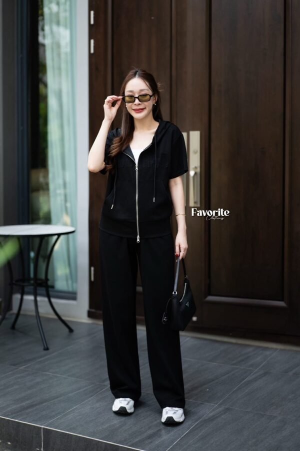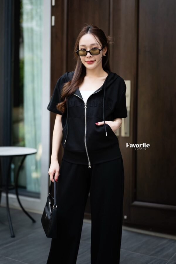 A stylish matching set featuring a short-sleeve tee with a cool attached hood. It features decorative lettering stitched across the chest, a front zipper detail, and a handy front pocket for a chic, casual look. The set comes complete with full-length pants featuring an elastic waistband that adjusts to your body shape, plus functional side pockets. This is the ultimate “chill-vibe” set—crafted from soft, comfortable fabric that feels amazing to wear. It’s perfect for everyday wear and is a timeless style that never goes out of fashion. Don’t miss out!!!!