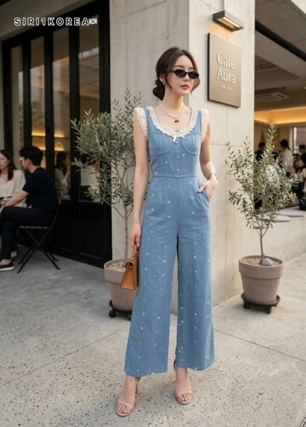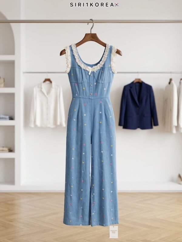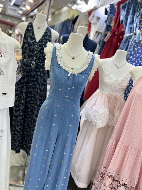 Denim fabric with cute embroidered patterns, easy to wear, and decorated with lace ruffles.