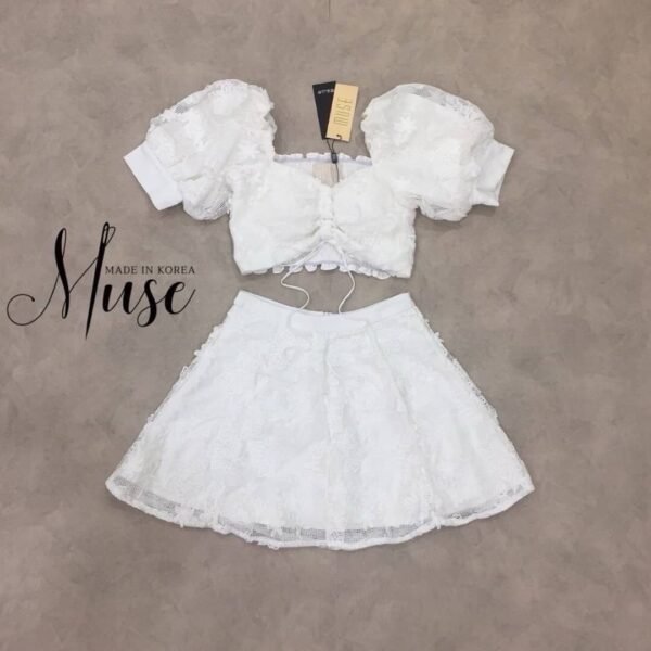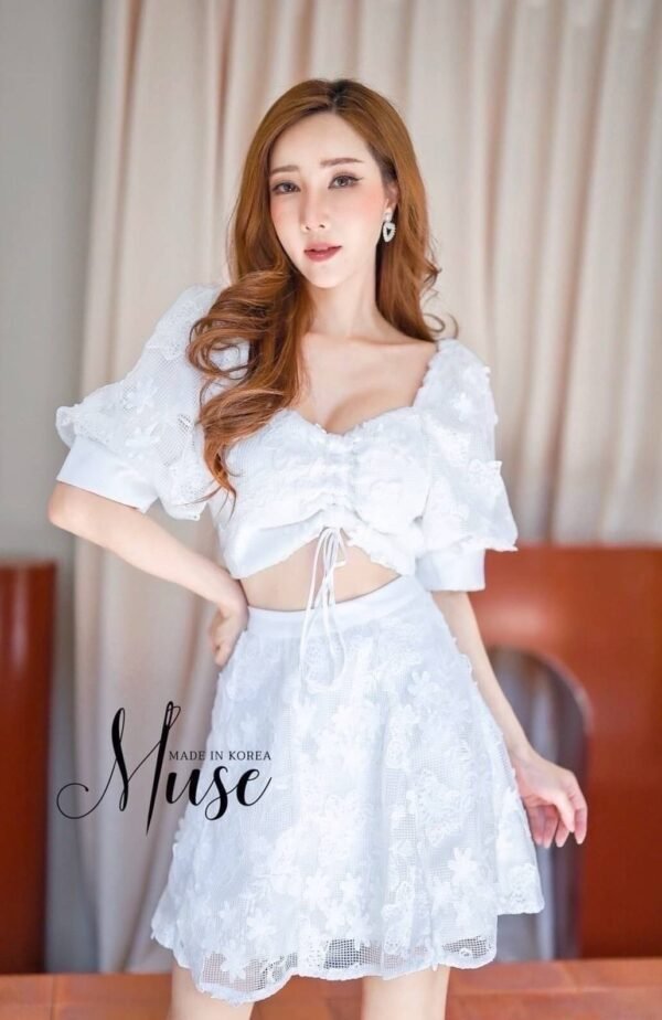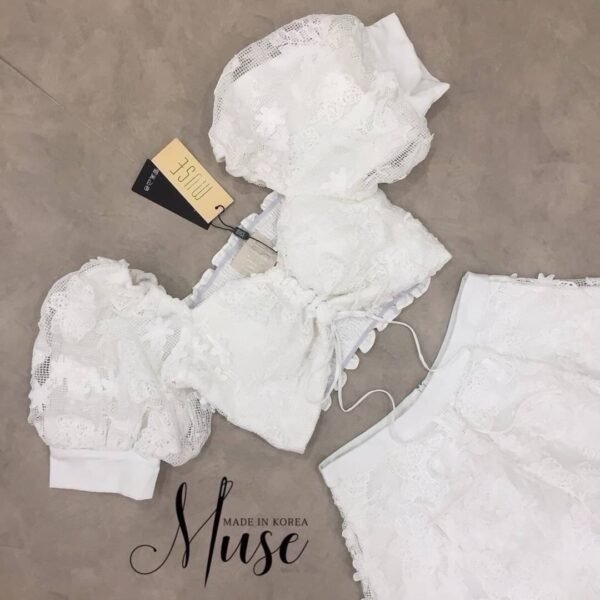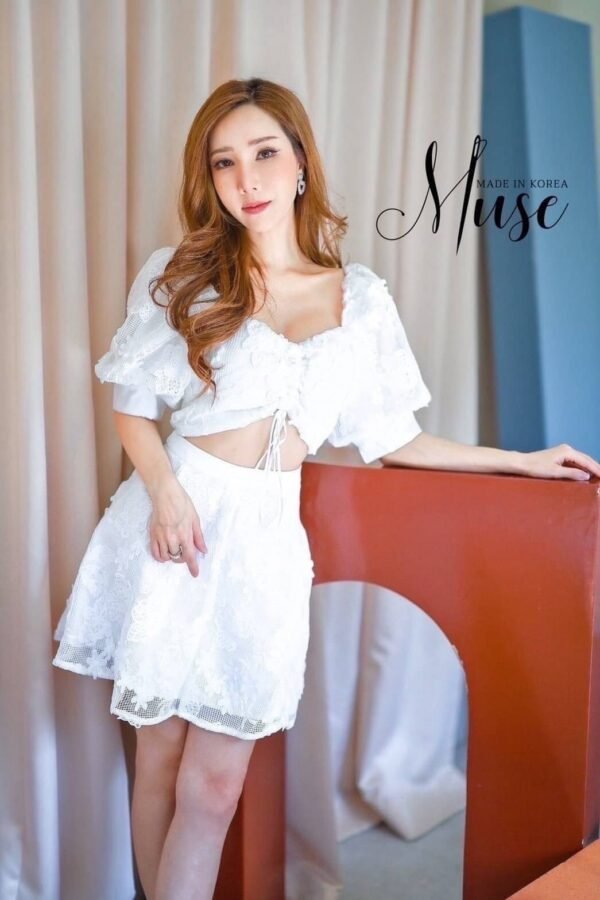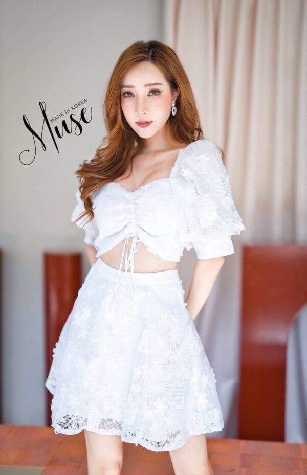 White lace crop top set. The sleeves are puffy, the lace fabric is gorgeous. The bust has a drawstring. Paired with a flared mini skirt. A must-have! Don’t miss out!