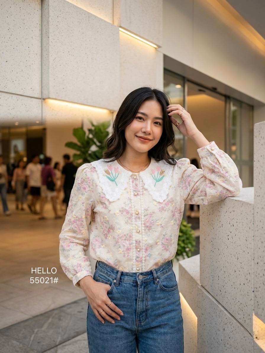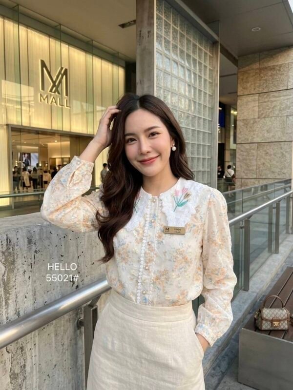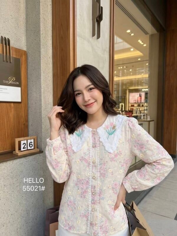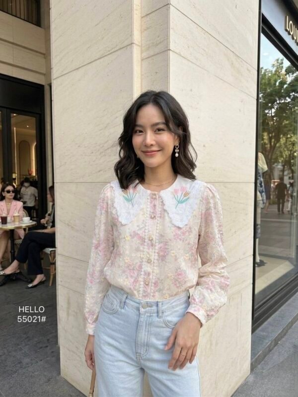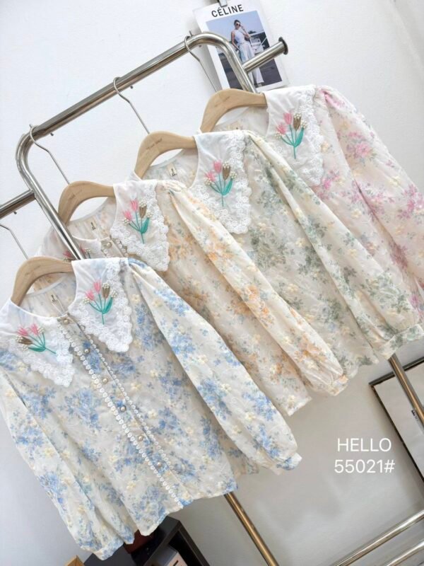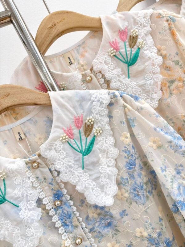 featuring a delicate floral cutout fabric pattern. Detailed with a decorative floral collar accent and beautiful pearl embroidery.