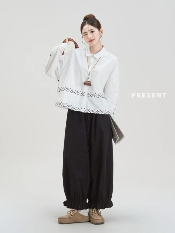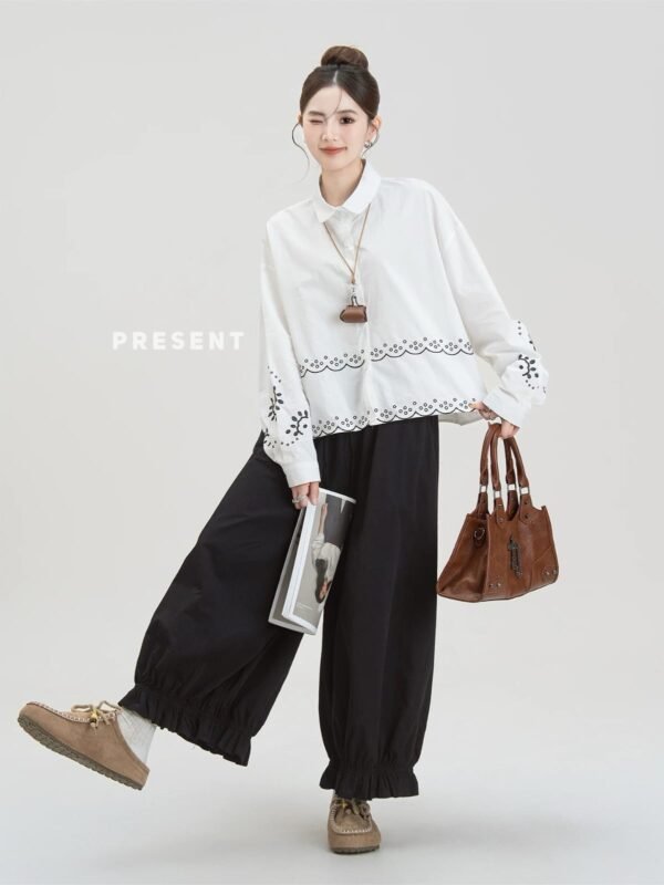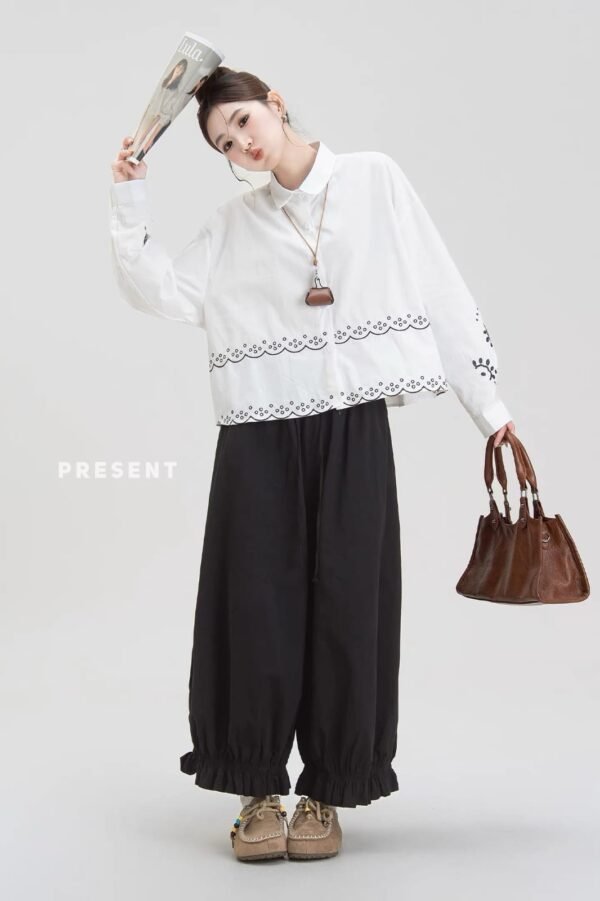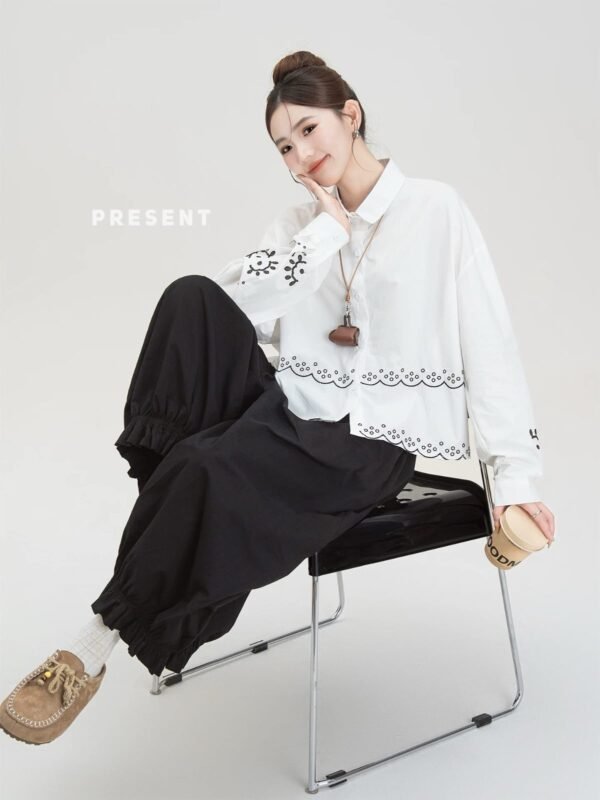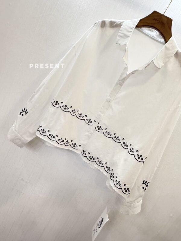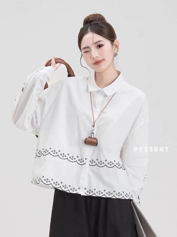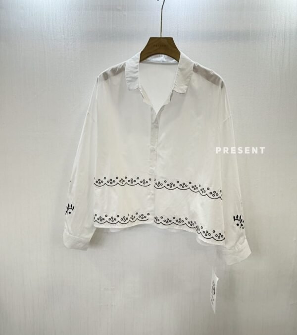 Long-sleeved collared shirt with front buttons. Embroidered wavy pattern on the hem and sleeves. Good length, not too short or too long.