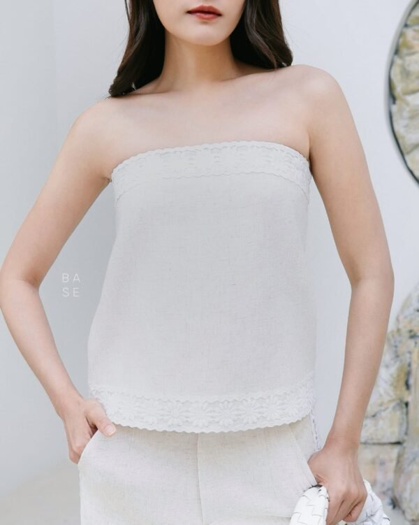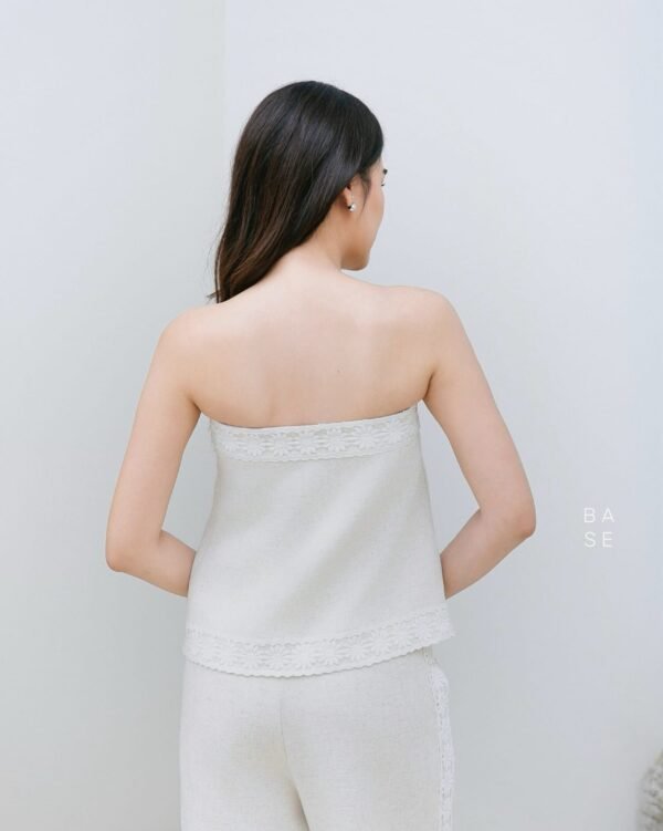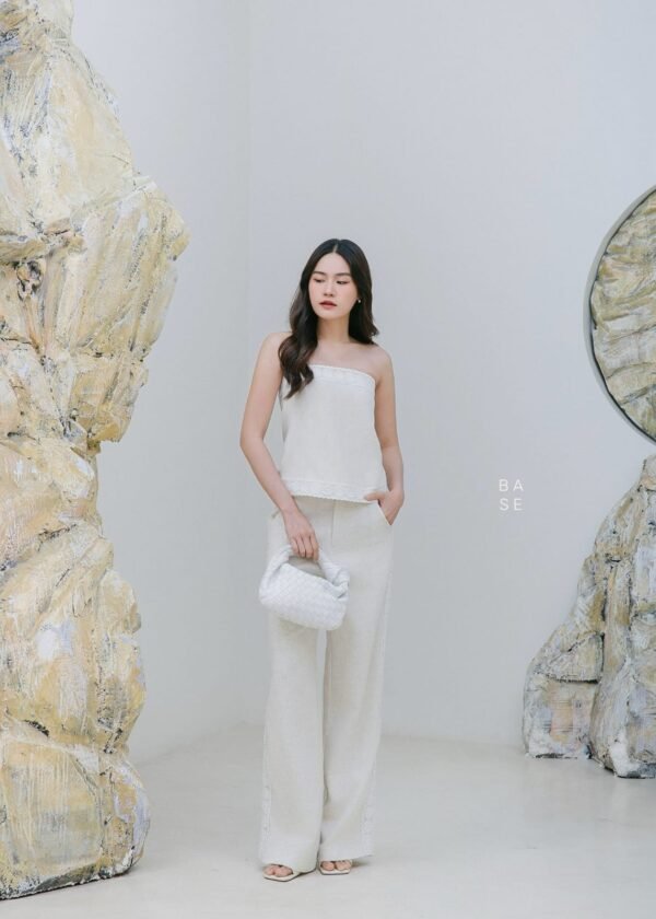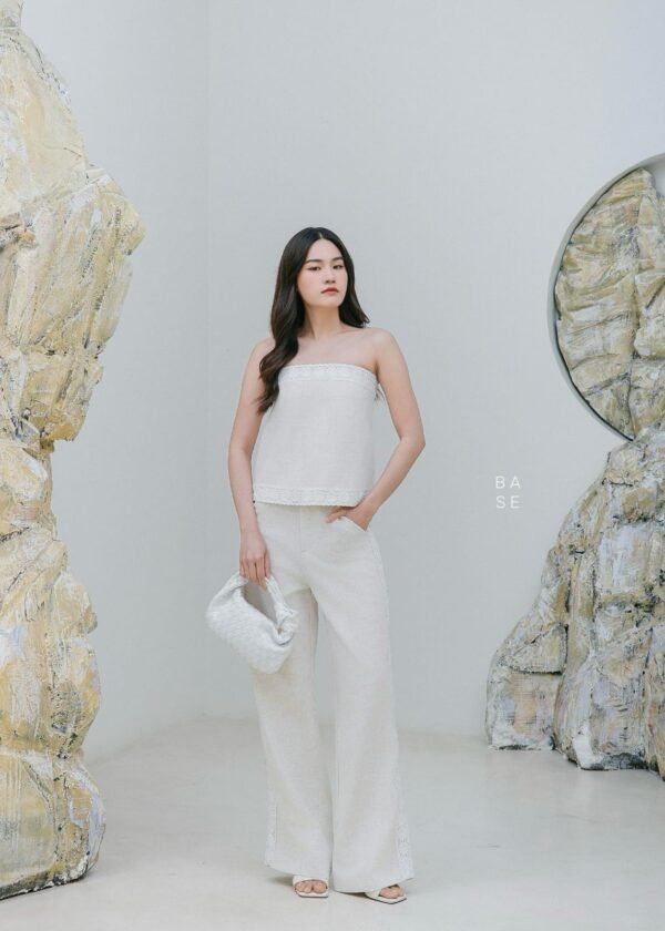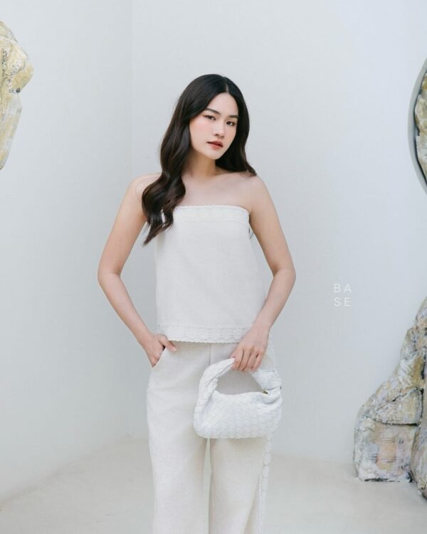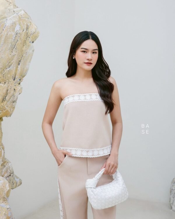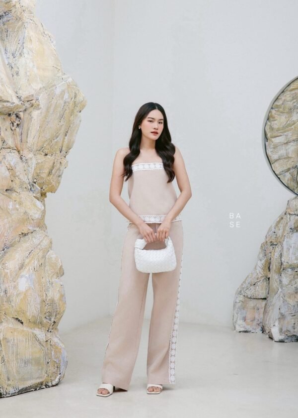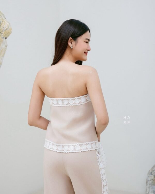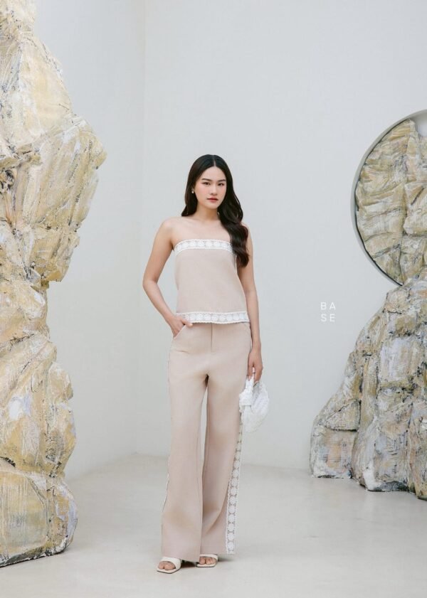 This set includes a strapless top with white lace trim that contrasts beautifully with the top’s color, giving it a luxurious and elegant look. It has an inner strip to prevent slipping. It comes with matching long pants with lace detailing on the sides, a stylish and unique design. The fabric is comfortable to wear. A must-have in your wardrobe!