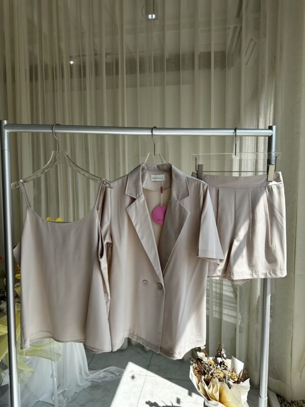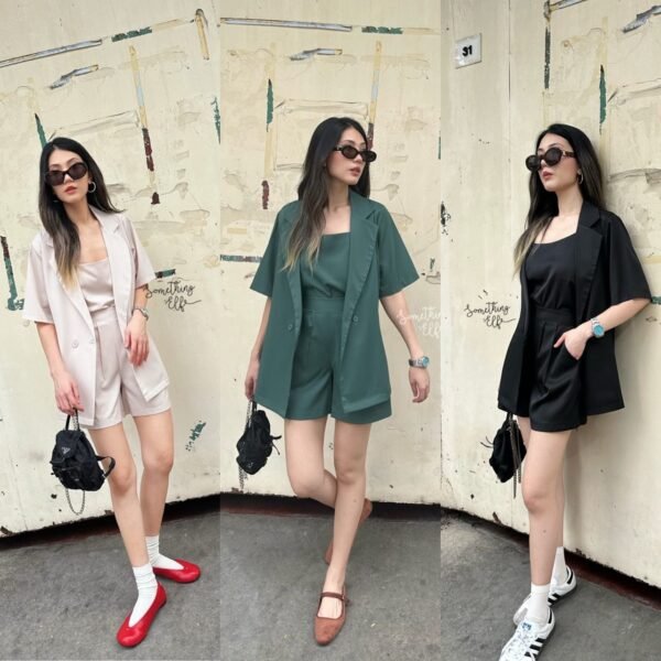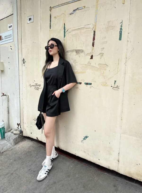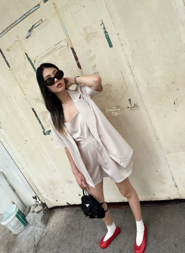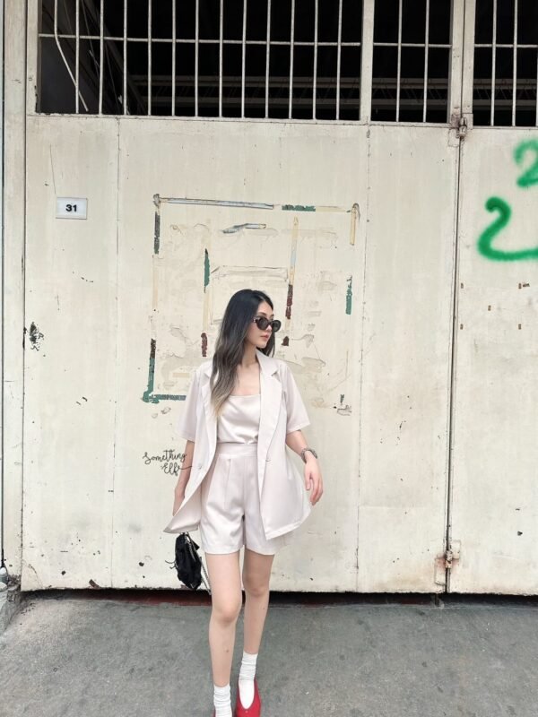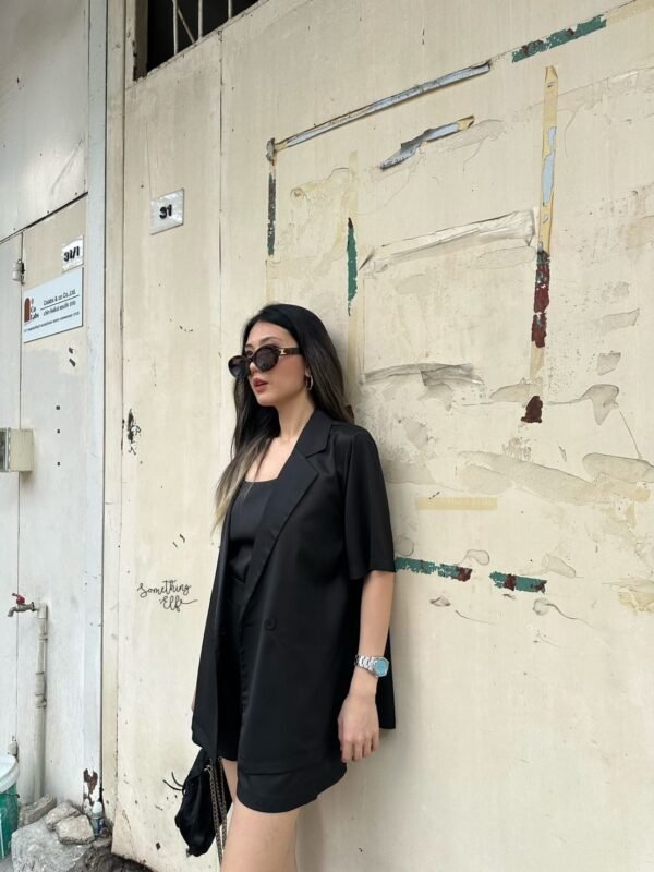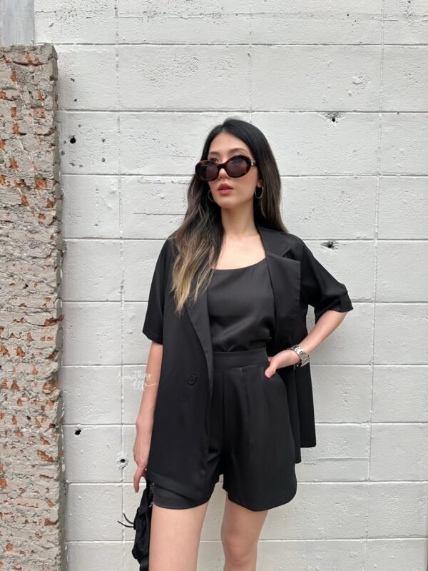 3-piece set: Oversized short-sleeved blazer, comes with a sleeveless camisole with adjustable straps, and shorts with an elasticated back waistband. Versatile and stylish. Good quality fabric and beautiful cut. Great value!