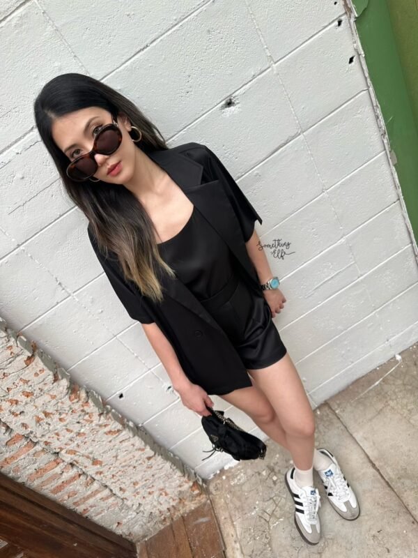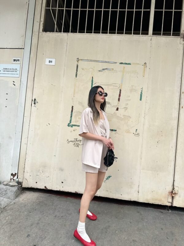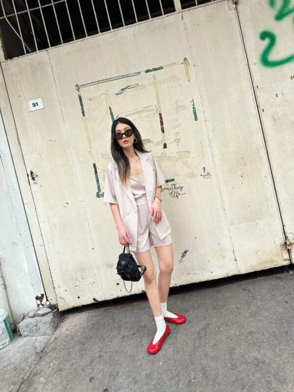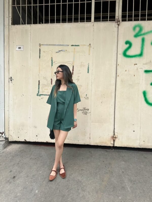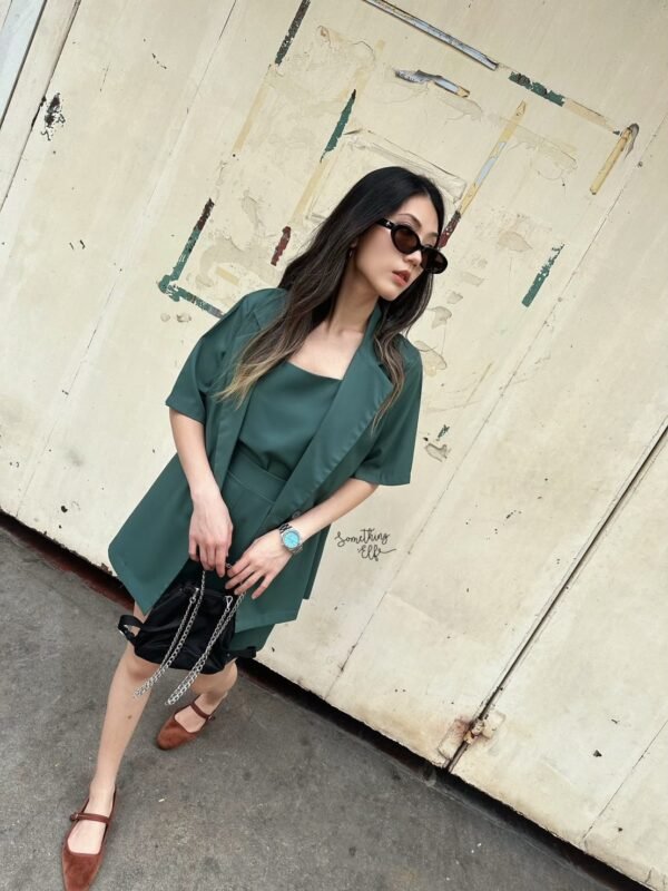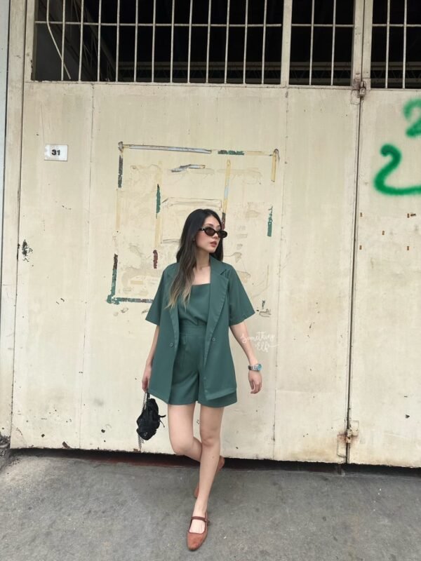 3-piece set: Oversized short-sleeved blazer, comes with a sleeveless camisole with adjustable straps, and shorts with an elasticated back waistband. Versatile and stylish. Good quality fabric and beautiful cut. Great value!