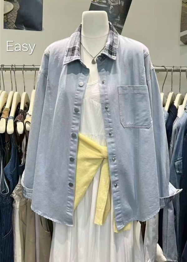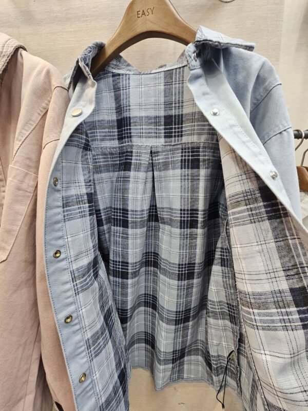 Features a plaid collar and cuffs, very cute.