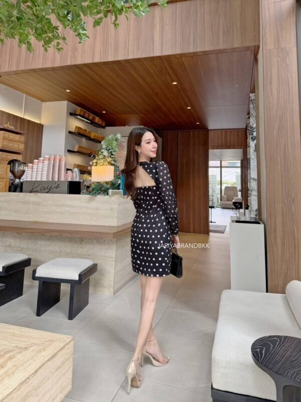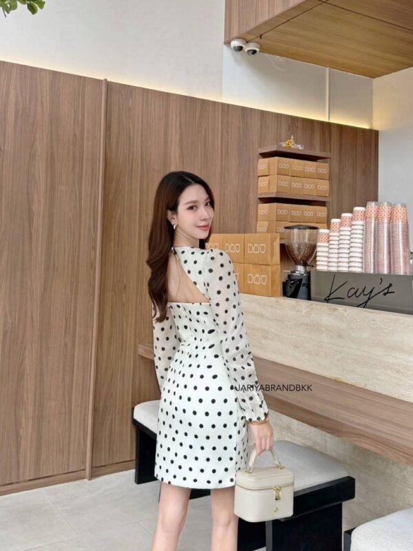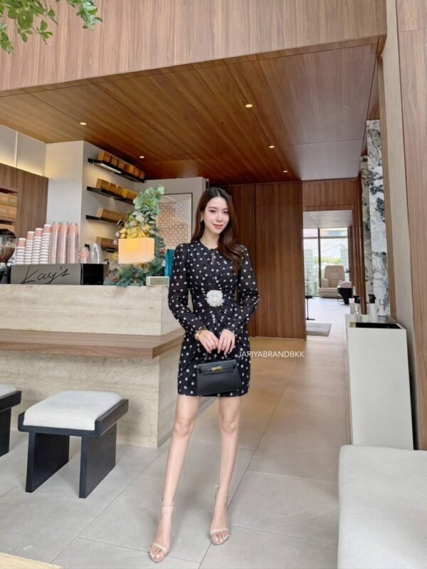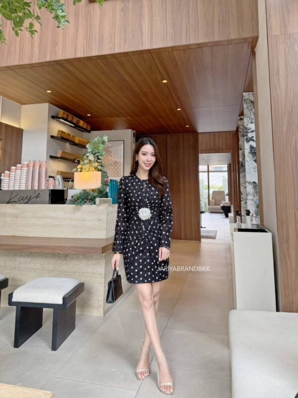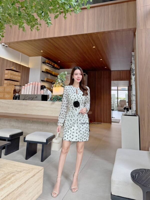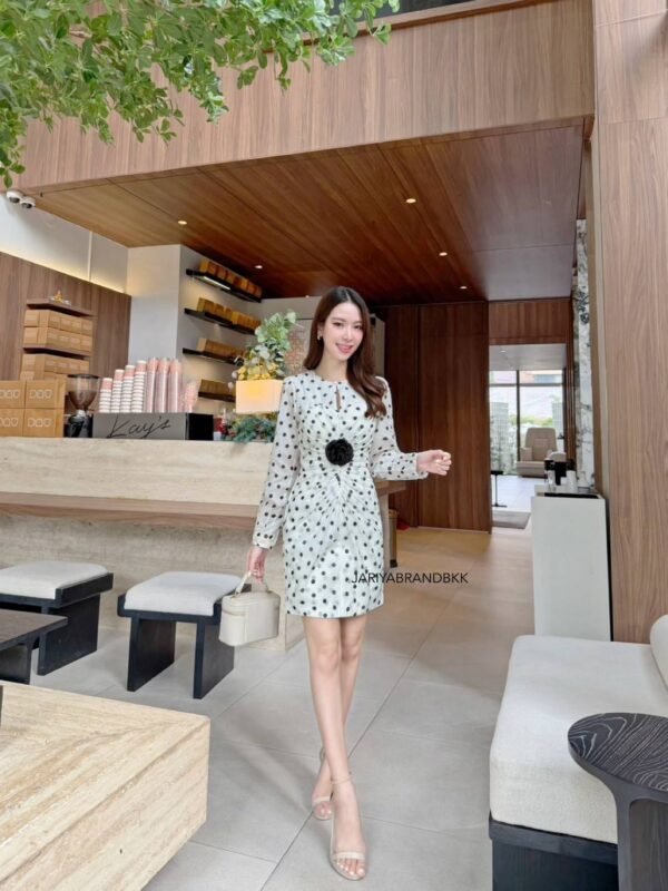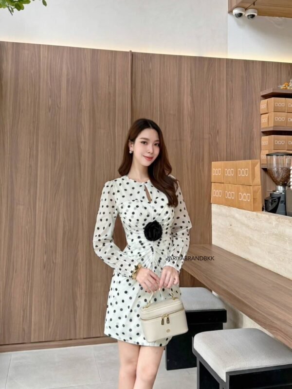 Long-sleeved polka dot dress decorated with a white flower brooch and an open back. Very beautiful, comfortable to wear, and looks great. The actual item is even more beautiful than the pictures. The fabric is very soft and comfortable to wear. The cut is flattering and the workmanship is beautiful; it looks very high-end and expensive.