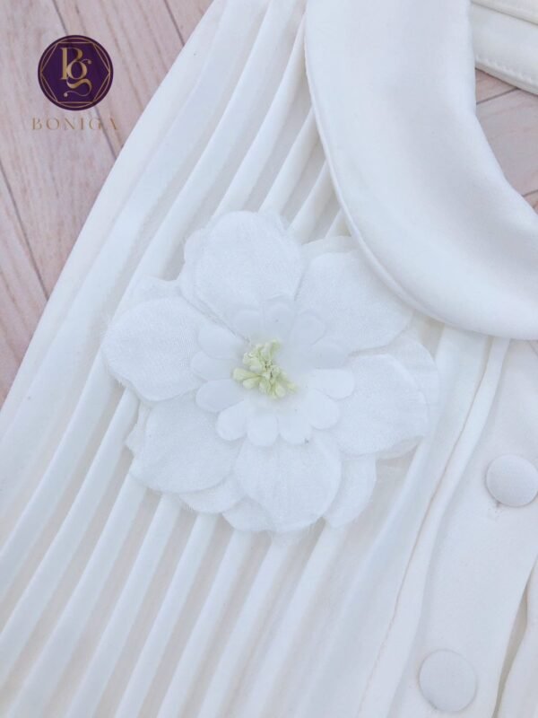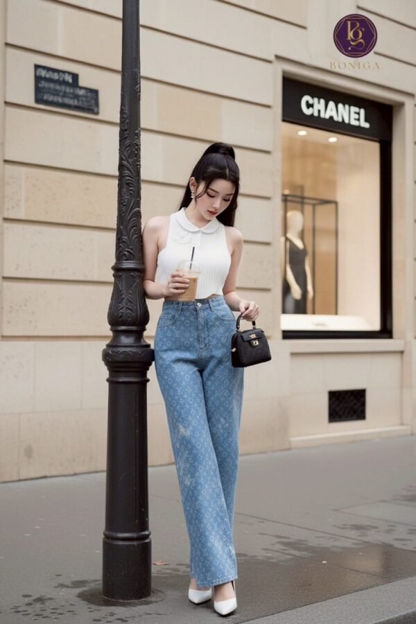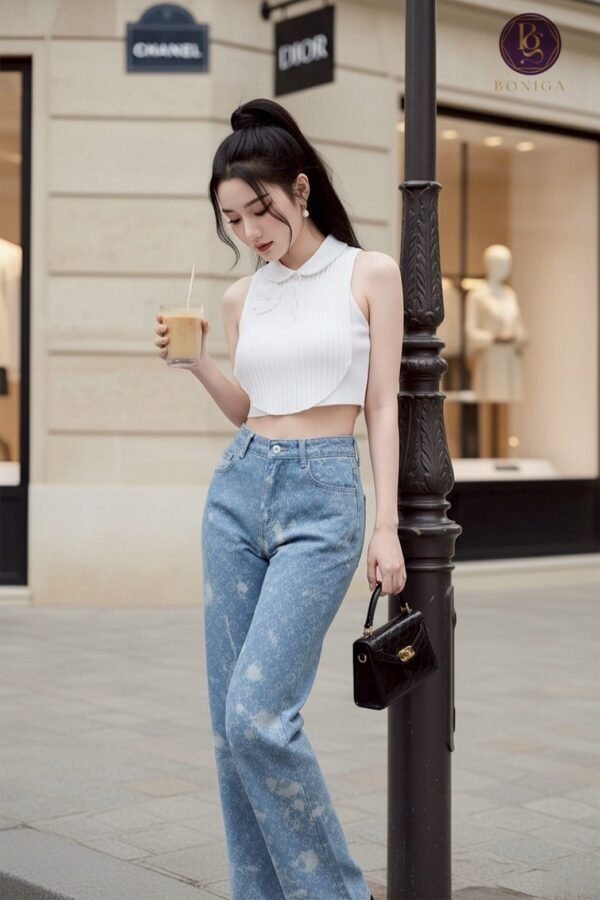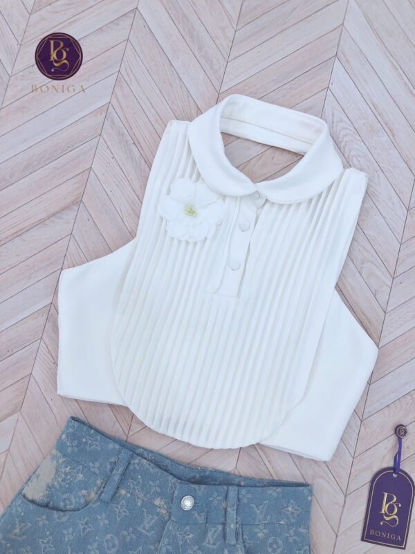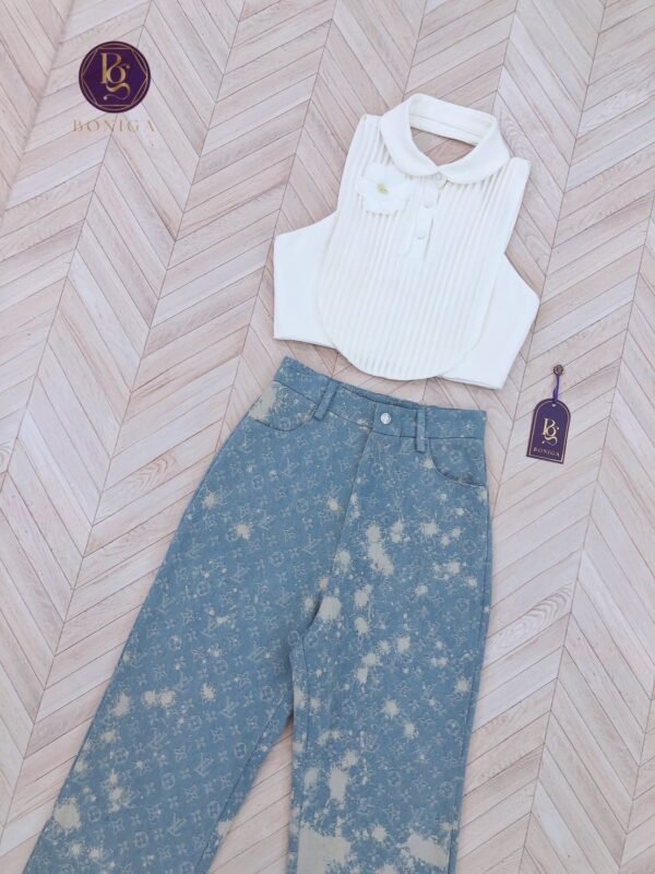 Detail:Set includes a sleeveless top and long pants. Comes with a flower brooch. The top has a Peter Pan collar, buttons, pleated detail on the bust, and a spaghetti strap back with a back zipper. The pants are made of woven denim. Good quality, weighty fabric. Comfortable to wear. Don’t miss out!