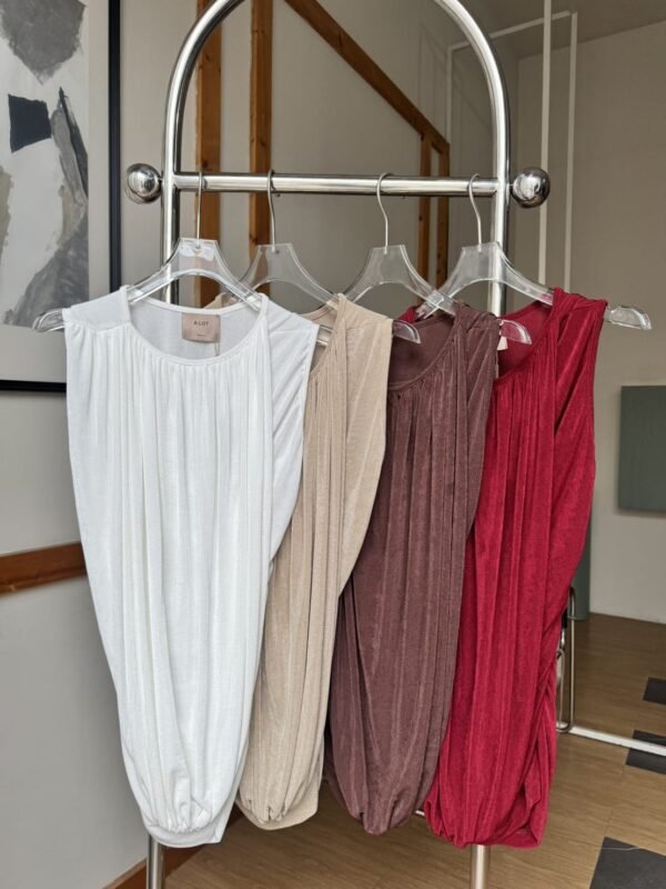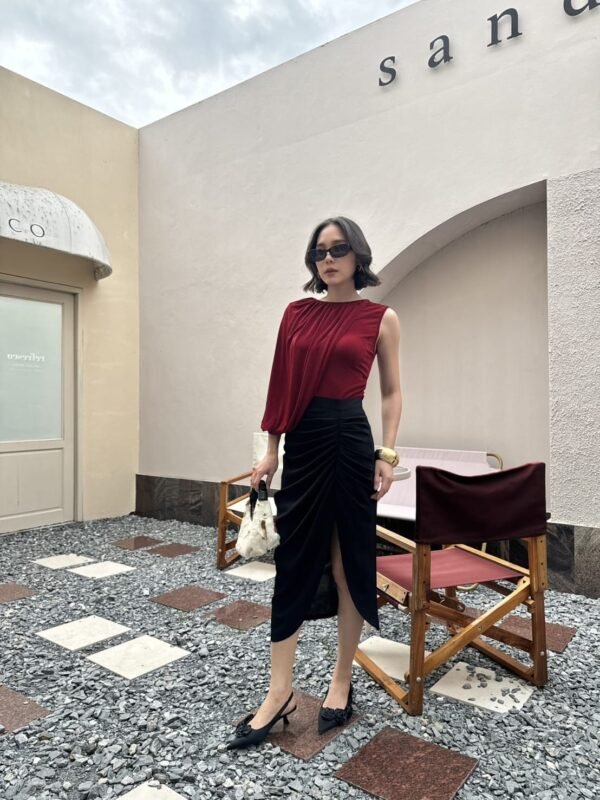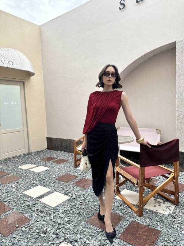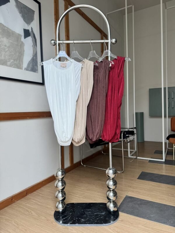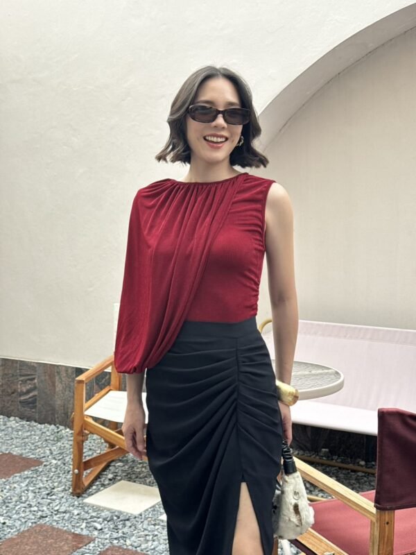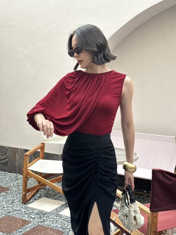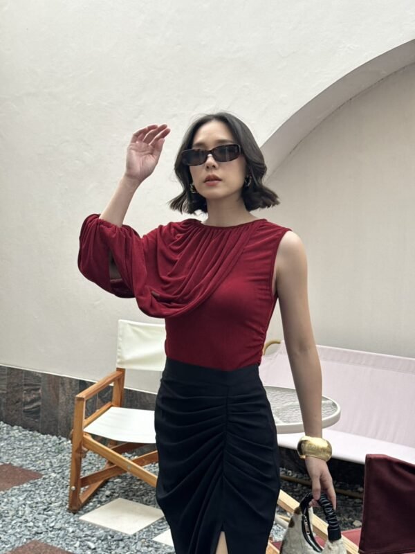 A stylish, stretchy top with an asymmetrical design. One side is sleeveless, the other features a draped shoulder that extends to the wrist. Effortlessly chic with a touch of glam.