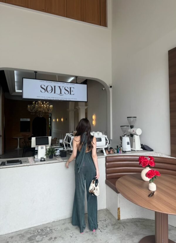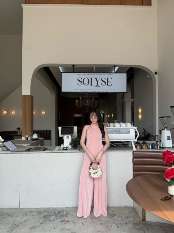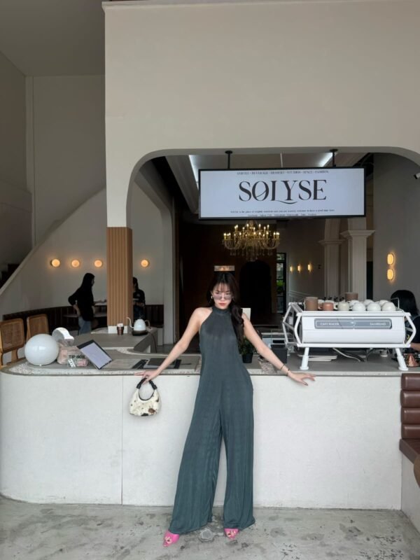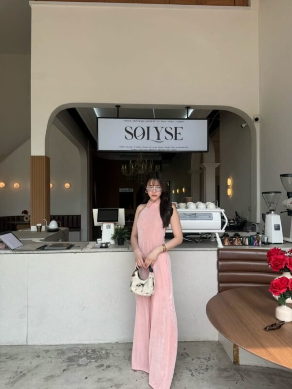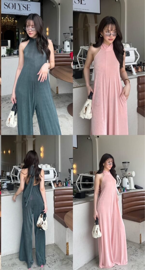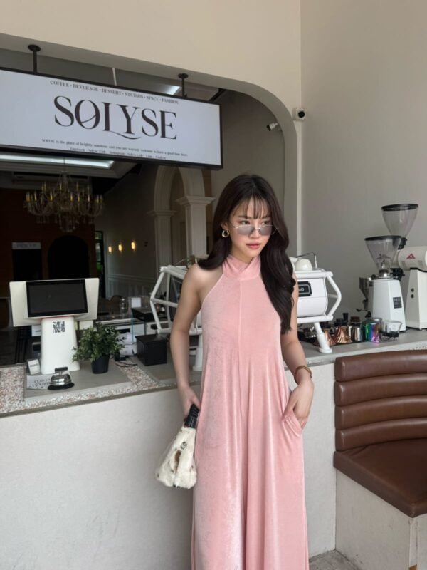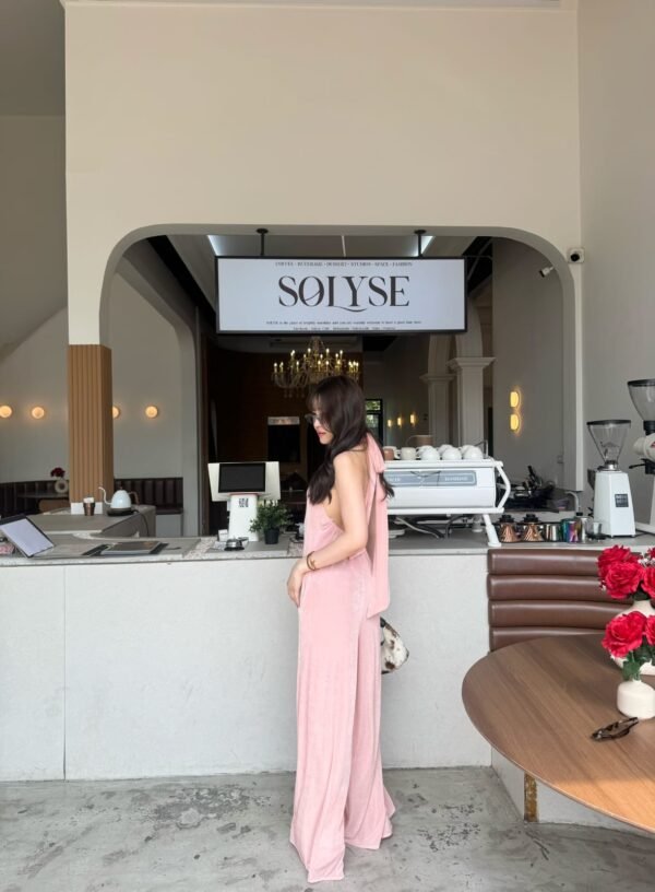 featuring a large decorative bow, a deep-cut open back, and two side pockets. Crafted from a soft, stretchy, ribbed fabric with a subtle shimmer—exceptionally comfortable to wear.