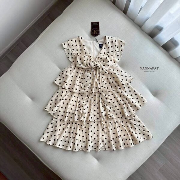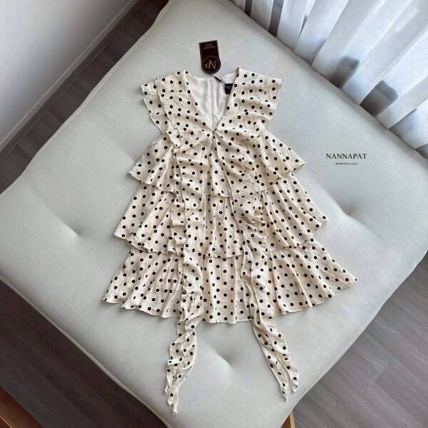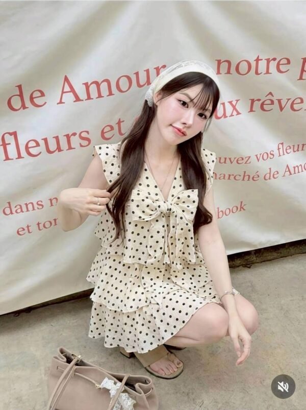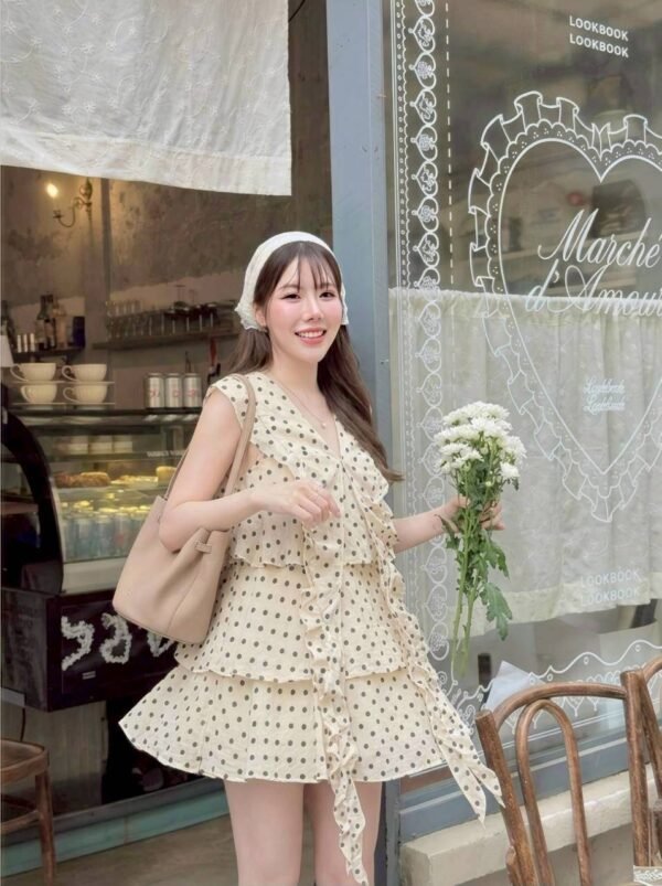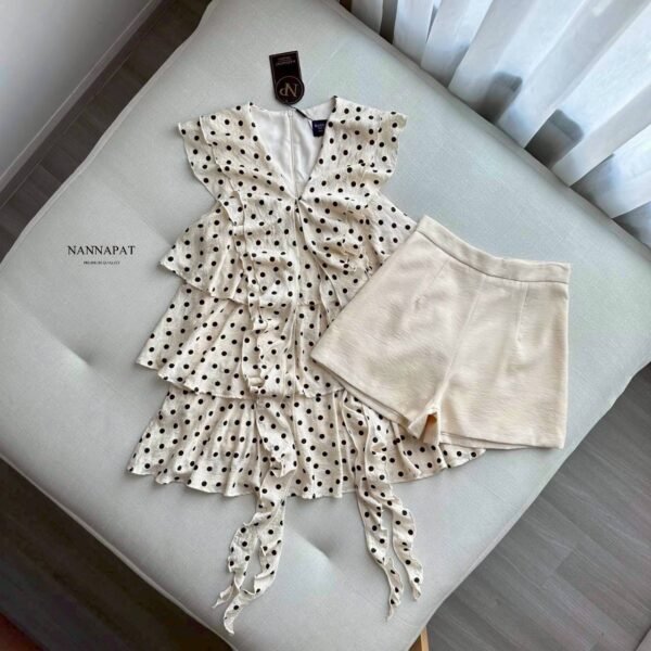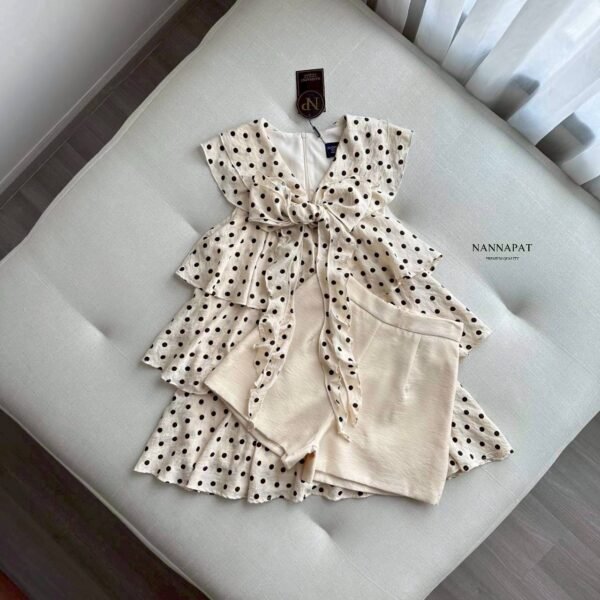 Featuring a V-neck polka dot top—set against a creamy background with black dots—that beautifully brightens your complexion. It is exquisitely detailed with tiered ruffled trim running all around the bodice, helping to flatter your figure and add dimensional volume. A sweet touch is added by fabric ties at the front; whether tied loosely or left to flutter freely, the look remains effortlessly stylish. The sleeveless design features ruffled armholes, ensuring a comfortable, non-restrictive fit. The matching cream-colored shorts complete the ensemble, creating a look that is incredibly photogenic from every angle. It’s a complete, stunning outfit in one set—no need to overthink it! This is an absolute wardrobe essential you simply must own!