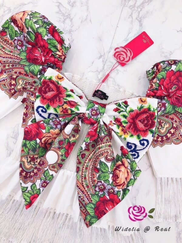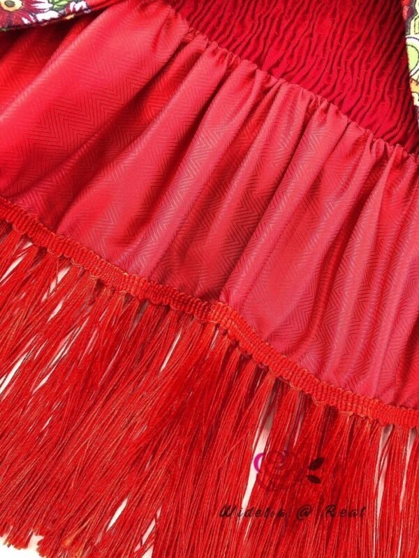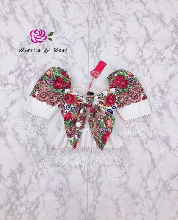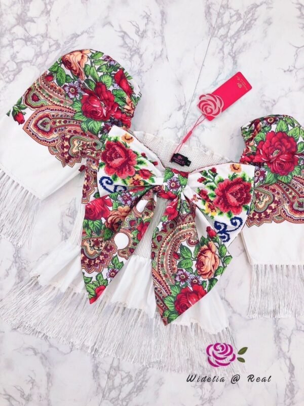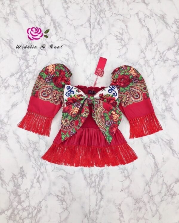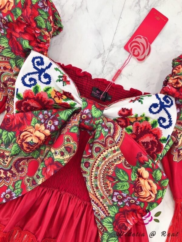 Detail: with puff sleeves, a large embroidered bow on the chest, side zipper, smocked back, and tassels throughout. High-quality, comfortable fabric. Beautifully made. Guaranteed to look amazing!
